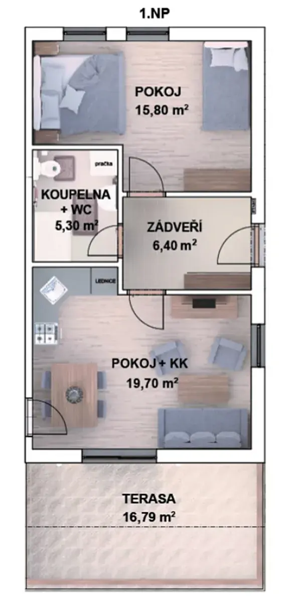 Moderní přízemní apartmán o velikosti 2+kk s terasou a podlahovou plochou 64 m² nabízí samostatný vstup, skvělou dopravní dostupnost, výhledy na přírodu Jeseníků.
