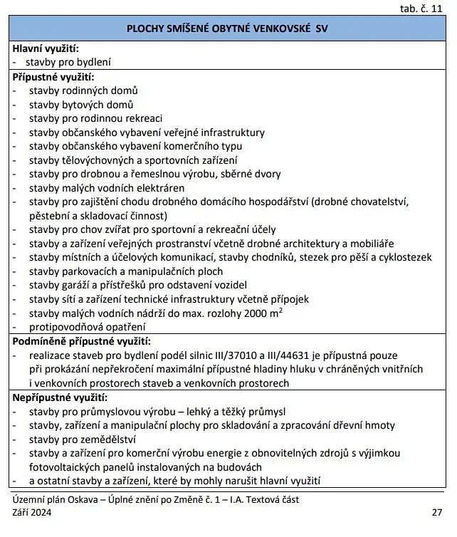Pozemek je v územním plánu označen jako plocha SV smíšená obytná venkovská. Lze využít jako relaxační či hospodářská zahrada se zdrojem vody z řeky Oskava, sad, drobná pastvina pro ovce a drůbež, prostor pro včelín. Je třeba respektovat blízkost řeky ve všech souvislostech. Koncepce územního plánu je založena na využití celkového potenciálu řešeného území, tedy i přírodního, vhodného k rekreačnímu využití. Jsou respektována stávající zařízení pro hromadnou rekreaci ve všech částech obce.