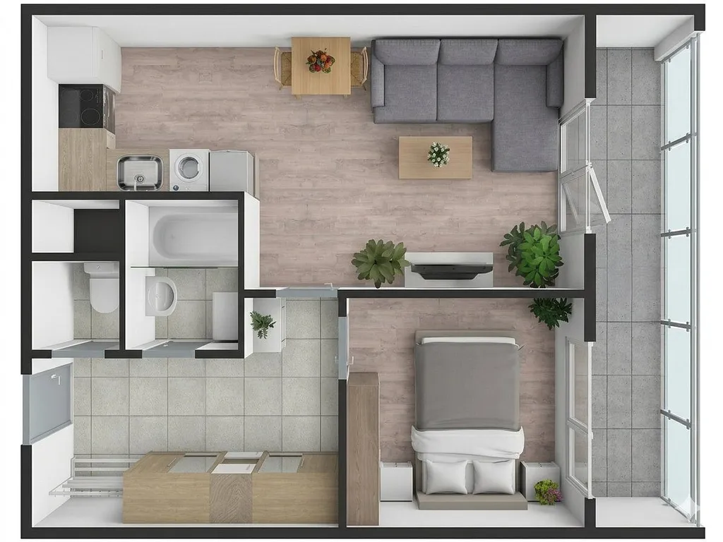 Hlavní obytný prostor tvoří obývací pokoj s kuchyňským koutem, který nabízí dostatek místa pro obývací i jídelní část. Samostatná ložnice poskytuje klidné zázemí pro odpočinek i dostatek prostoru pro úložné řešení. Koupelna je vybavena sprchovým koutem a umyvadlem, toaleta je oddělena.