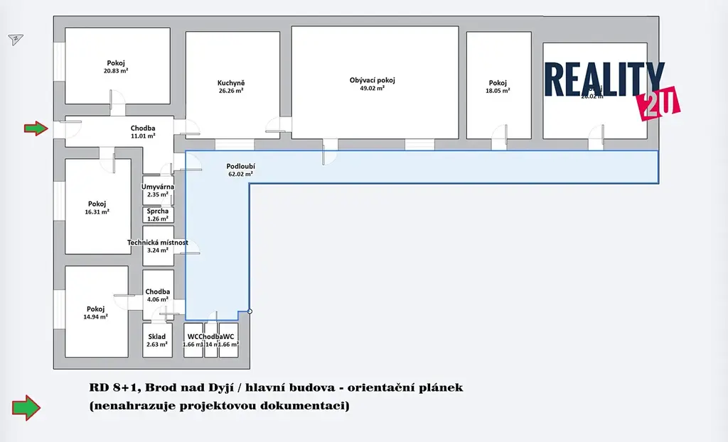 Podélné venkovní podloubí o ploše 62 m² obepíná hlavní budovu — atraktivní prostor pro posezení, venkovní stolování nebo chillout zónu