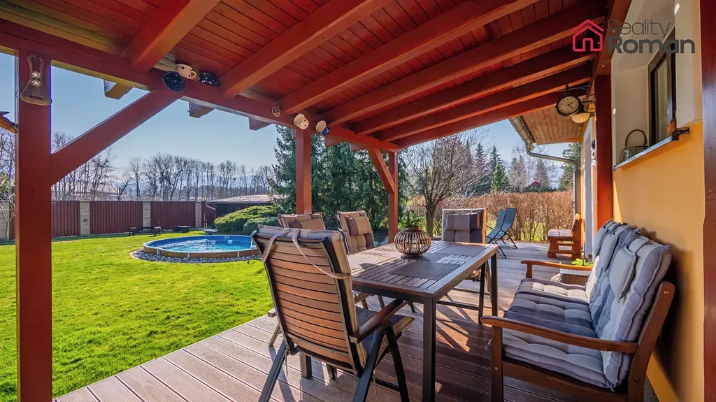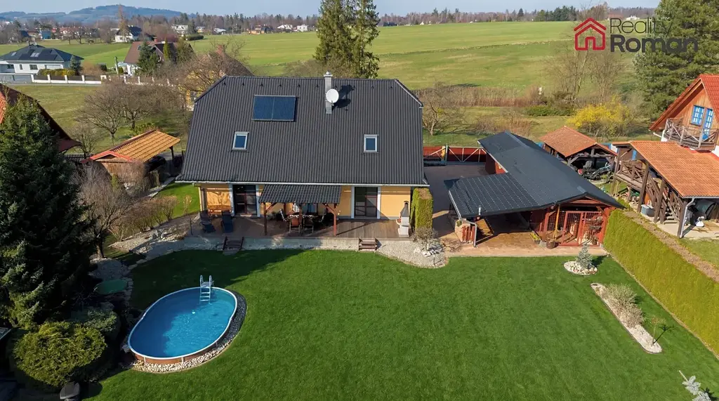 Zahrada je udržovaná se vzrostlou zelení a relaxačními zónami. Součástí je bazén s tepelným čerpadlem, terasa (cca 40 m²) a venkovní krb.
