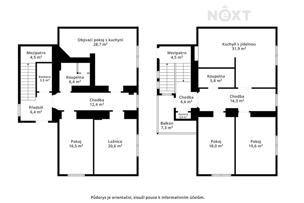 2. podlaží (106,8 m²): Moderní kuchyně s jídelnou (31,9 m²), dva velké pokoje (19,6 m² a 18,0 m²), koupelna, balkon (7,3 m²) a prostorná chodba.