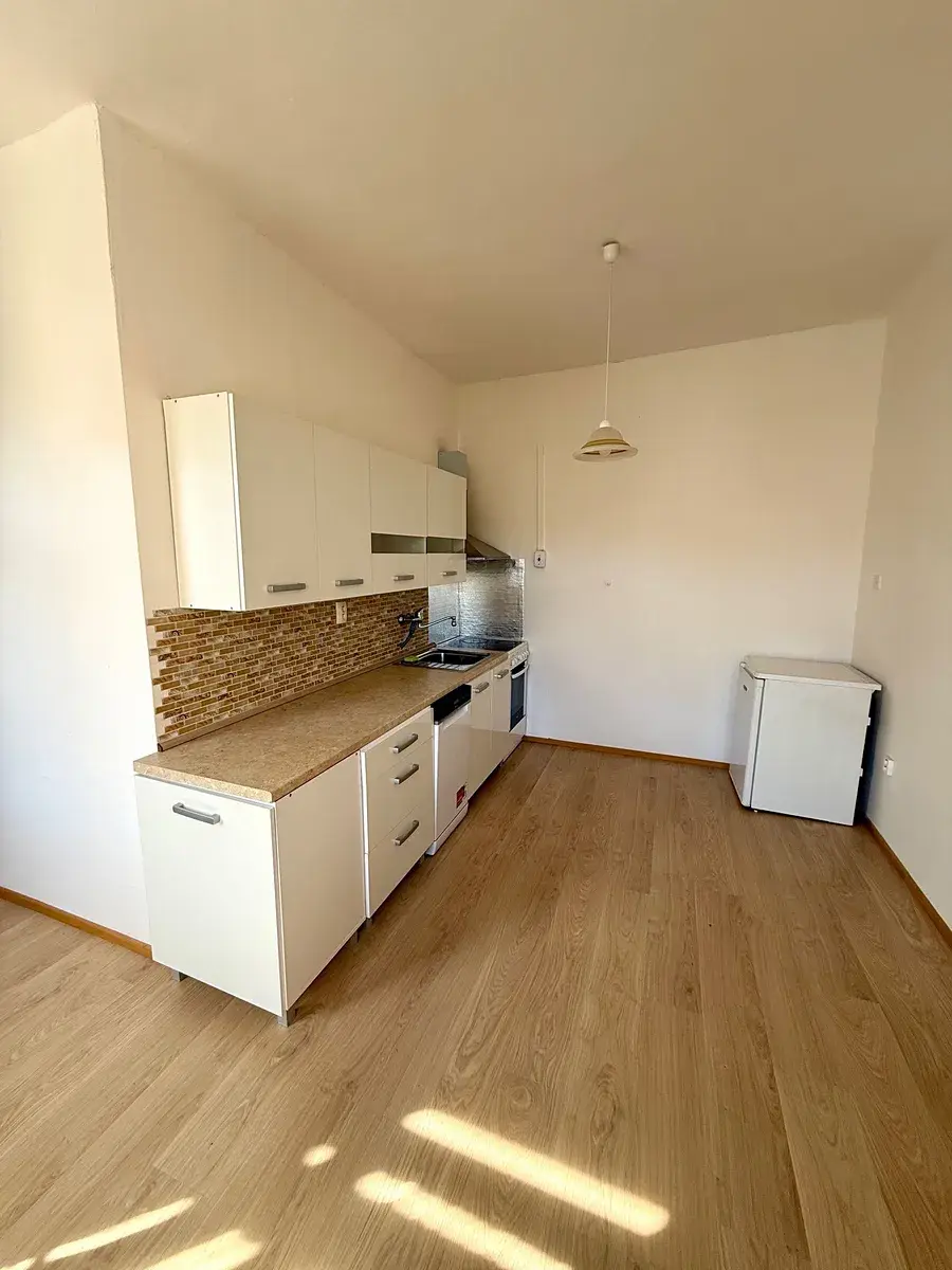 Byt má samostatnou kuchyni s jídelním stolem, průchozí obývací pokoj, ložnici, koupenu s vanou a pračkou, a samostatnou toaletu.