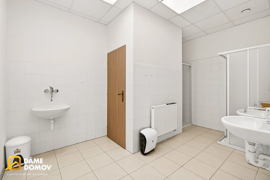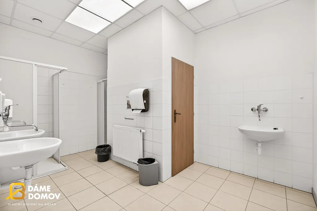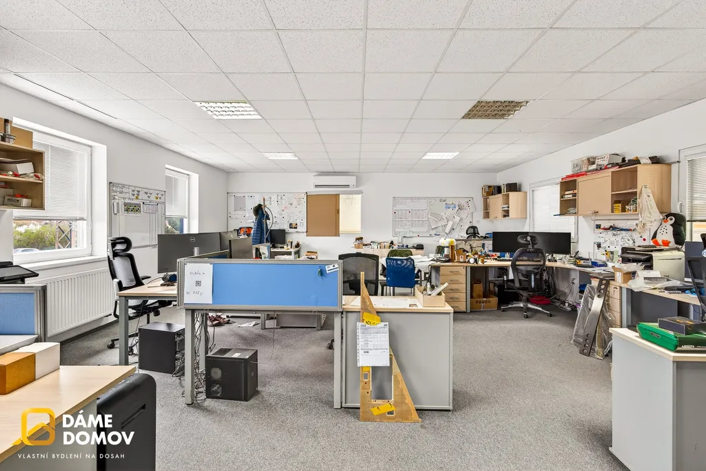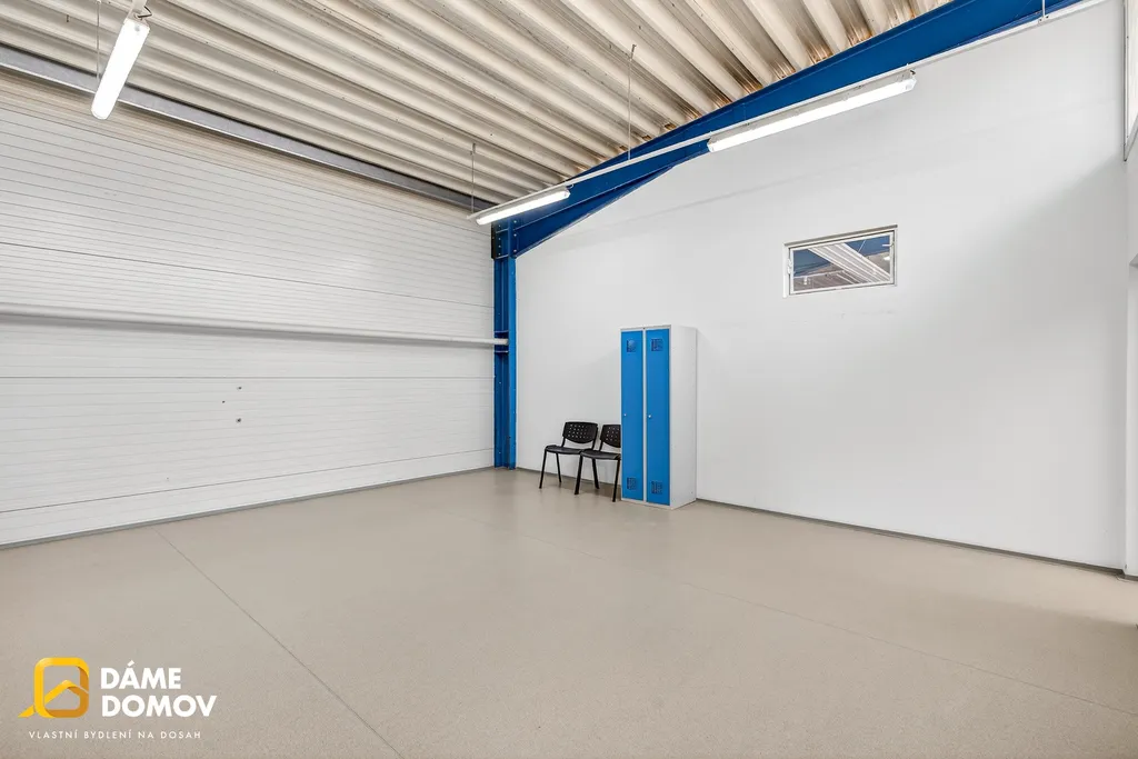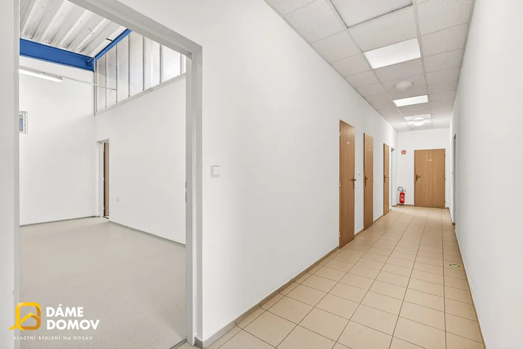 Součástí objektu je také administrativní zázemí v patře, kde najdete kanceláře, jídelnu i sociální zařízení – vše potřebné pro pohodlný chod firmy na jednom místě.