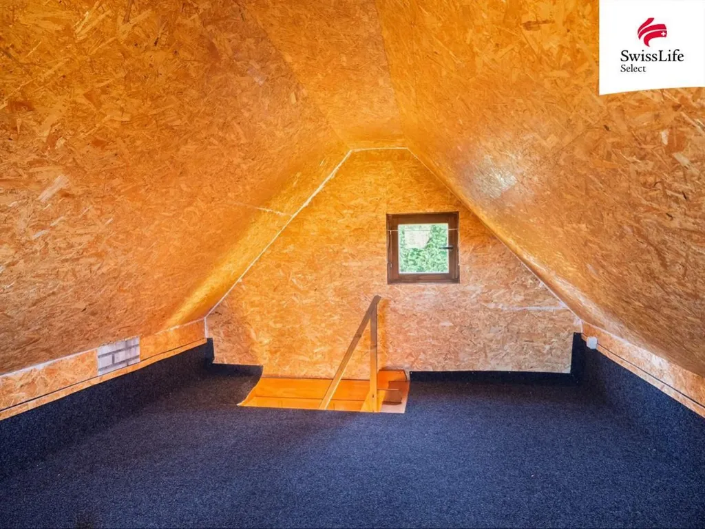 Podkroví nabízí útulnou ložnici s příjemnou atmosférou a výhledem do okolní zeleně. Chata je podsklepená, což poskytuje praktické zázemí pro uskladnění nářadí. Toaleta je řešena samostatně z boční strany objektu.