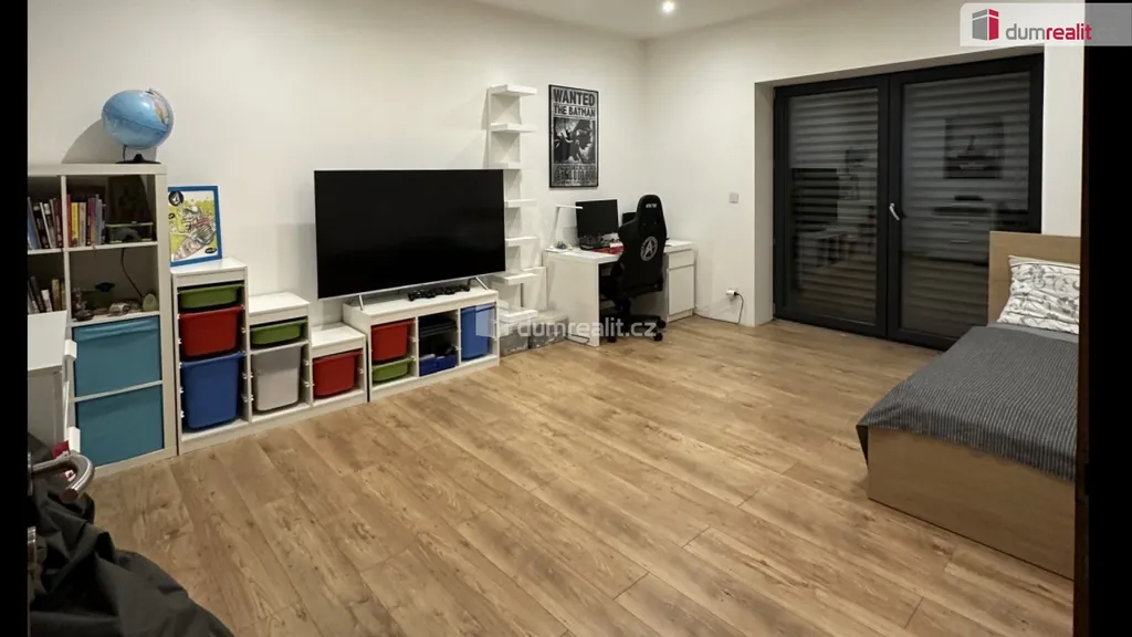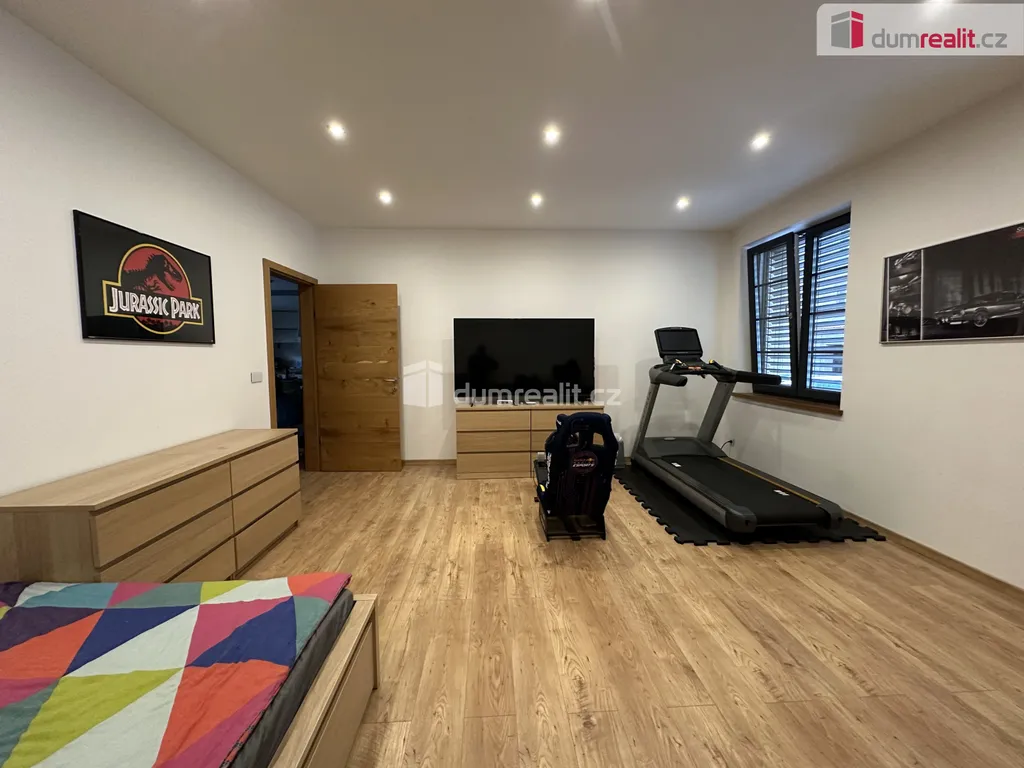 Z obývací částí domu pak dále vstupujeme do 4 samostatných místností v podobě dvou dětských pokojů, ložnice a pracovny. Samozřejmostí je prostorná koupelna s toaletou a šatna. Po dřevěných podsvícených schodech se dostáváme do patra, které tvoří vstupní část domu. Opačným směrem ve vstupním vestibulu sejdeme pouze pár schodů a tím se dostaneme do technické části. Zde je umístěn velmi moderní plynový kondenzační kotel, který obstarává teplou vodu a teplo domova. Dále do navazující sklepní části, která slouží i jako prádelna.