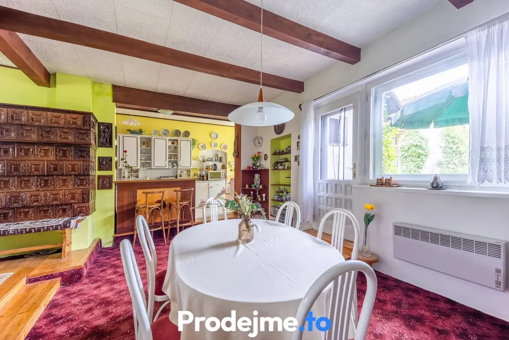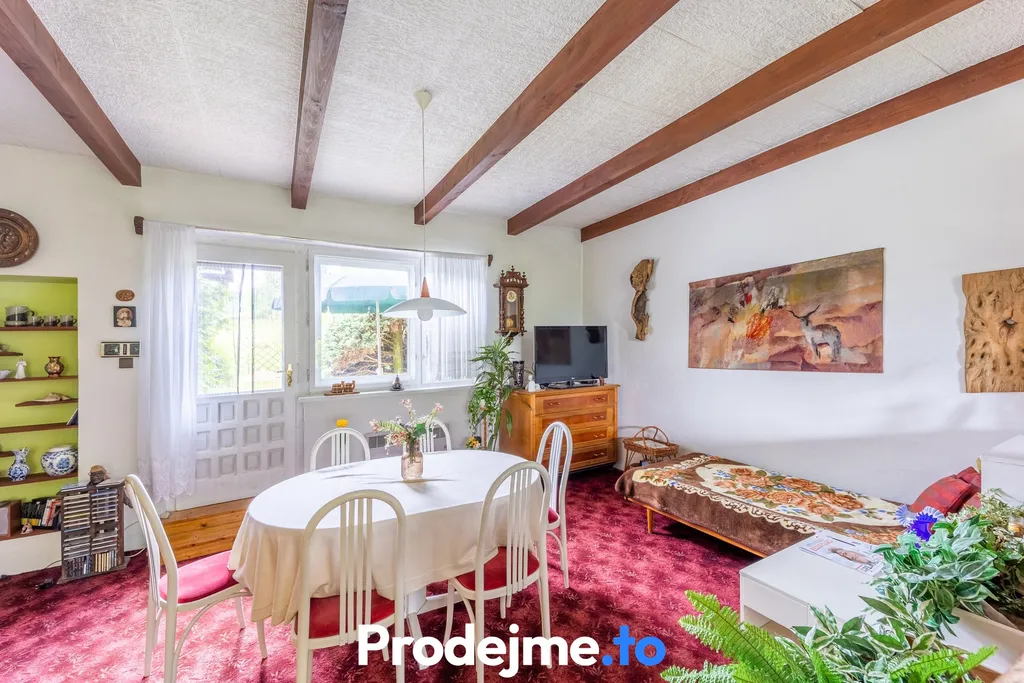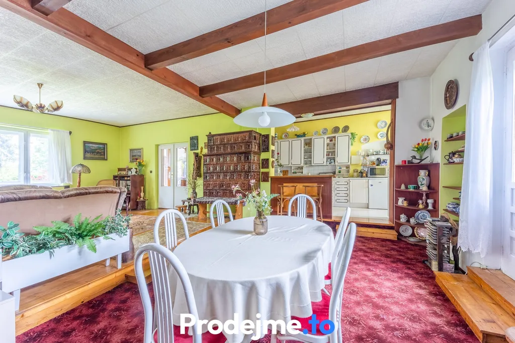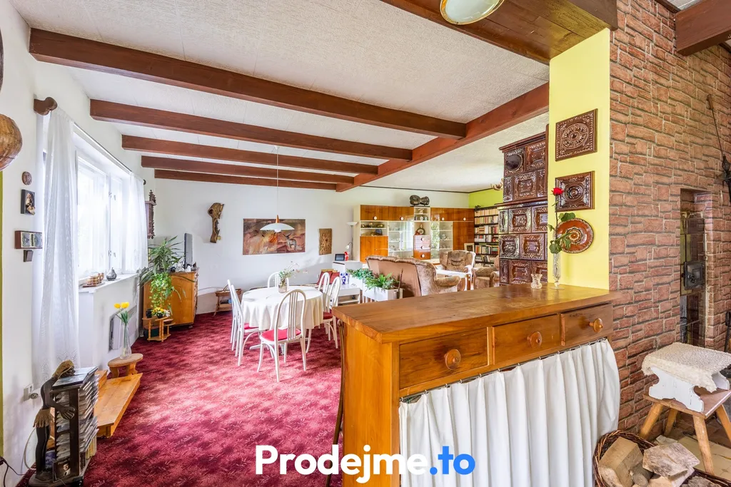 Součástí domu je velký obývací pokoj s kuchyňským koutem; v obývací části jsou kachlová kamna, která dodávají prostoru příjemné teplo i atmosféru. Z obývacího pokoje je přímý vstup na venkovní terasu o velikosti 10 m2, ideální na letní posezení s výhledem do zeleně.