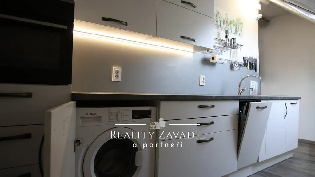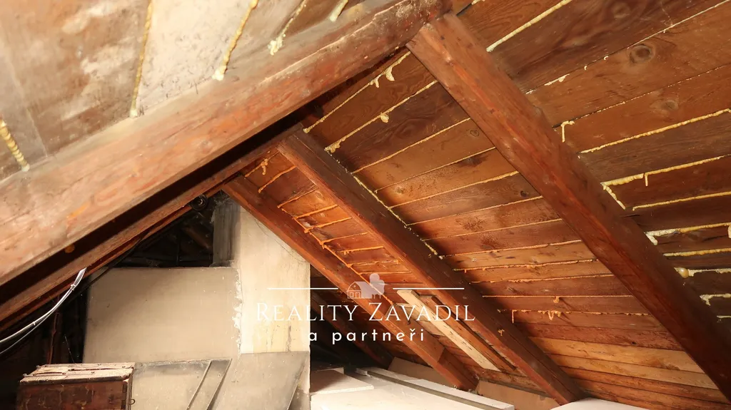 Dominantou domu je centrální chodba s masivním zděným schodištěm vedoucím do podkrovního patra. Horní podlaží prošlo rekonstrukcí – naleznete zde moderní kuchyňskou linku včetně spotřebičů ( indukční varná deska Elektrolux, vestavná pračka Bosch, vestavná myčka Elektrolux, kombinovaná trouba/mikrovlnka a gril Elektrolux ). Dále zrekonstruovanou koupelnu ( sprchový kout, umyvadlo a toaleta ), dvě obytné místnosti sloužící jako obývací pokoj a ložnice i podkrovní místnost vhodnou pro šatnu, pracovnu či malý pokoj. Na chodbě jsou krbová kamna na dřevo, která bezproblémově zajistí tepelný komfort v celém bytě.