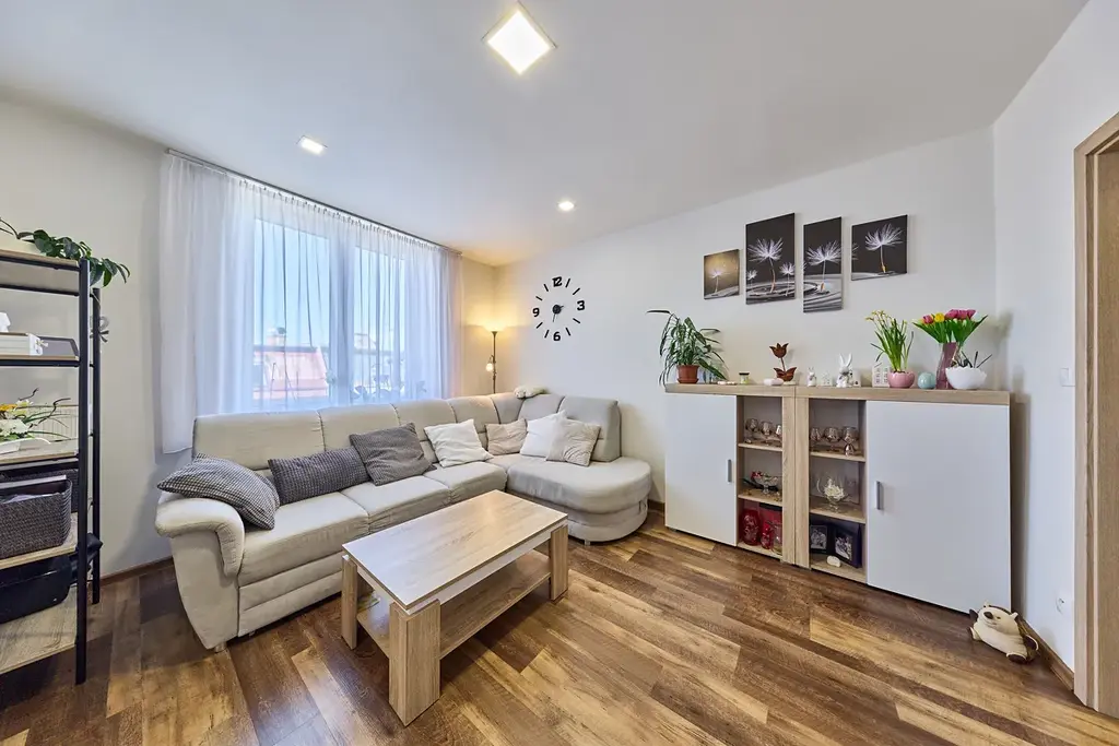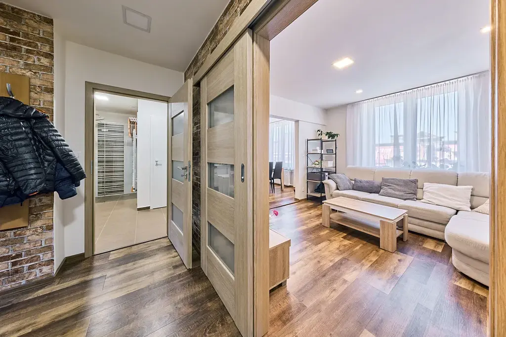 Dispozice bytu: předsíň s vestavěnými skříněmi, po pravé straně je obývací pokoj a z něho vstup do kuchyně s jídelním koutem. V předsíni je praktická komora, dále koupelna se sprchovým koutem, samostatné WC. V levé části bytu je ložnice a prostorný dětský pokoj. K bytu patří sklep o nadstandardní velikosti 7m2 umístěný v 1.PP domu. Byt je ideální pro rodinu s dětmi.