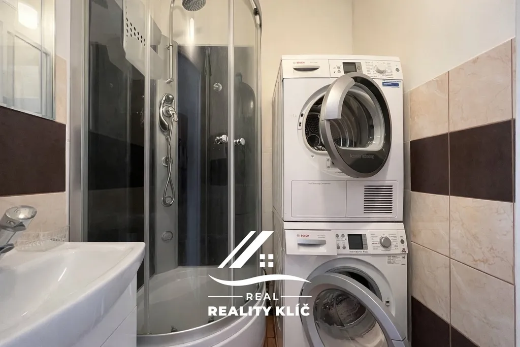 Dispozice zahrnuje kuchyň s kuchyňskou linkou vybavenou spotřebiči, spíží, jídelním stolem a lednicí. Dále zde naleznete samostatnou místnost vedenou jako ložnici, ve které se nachází vestavěná skříň a televize. Koupelna je vybavena sprchovým koutem a disponuje pračkou a sušičkou. Součástí bytu je také samostatné WC.