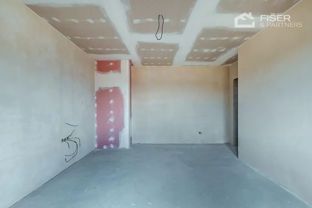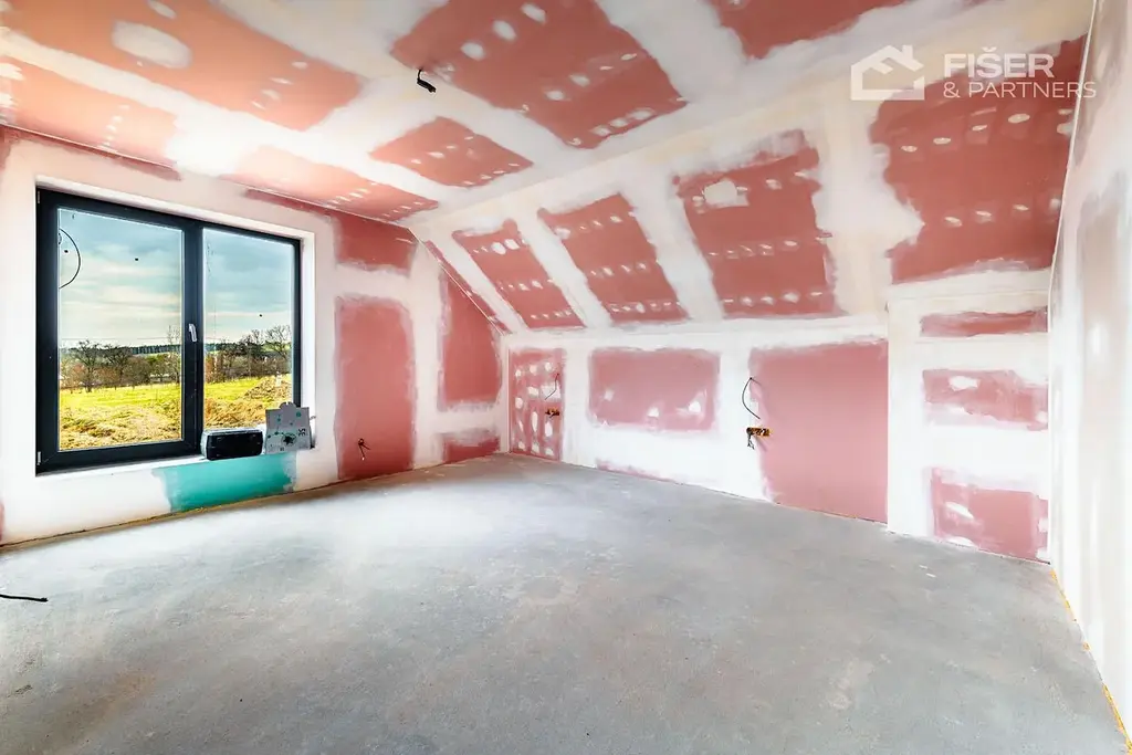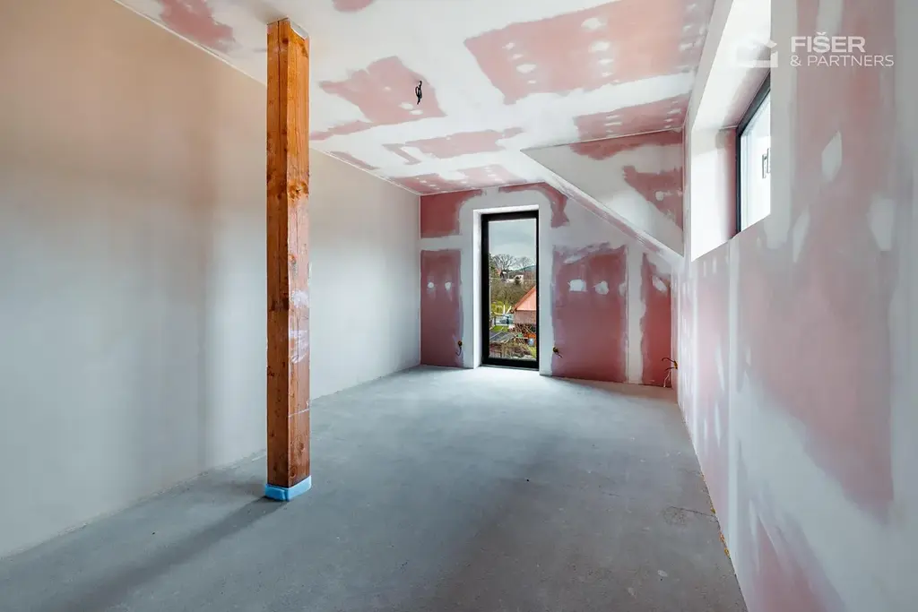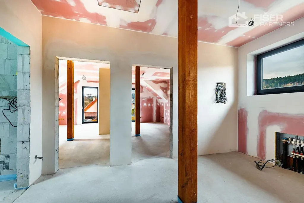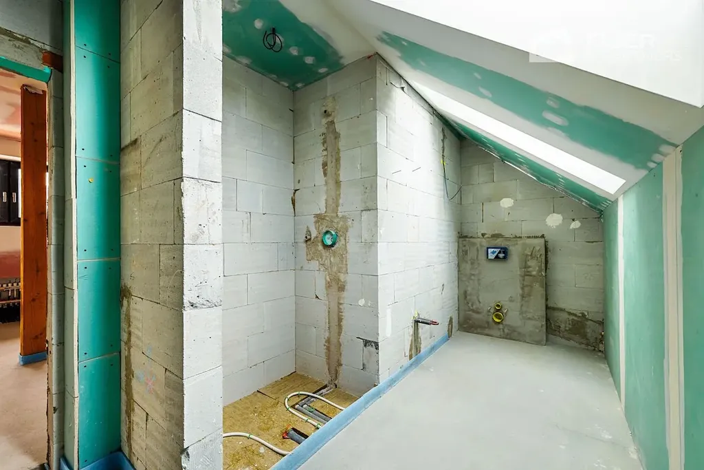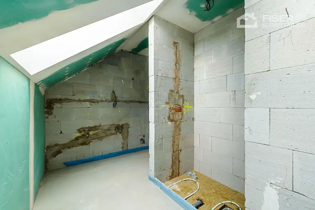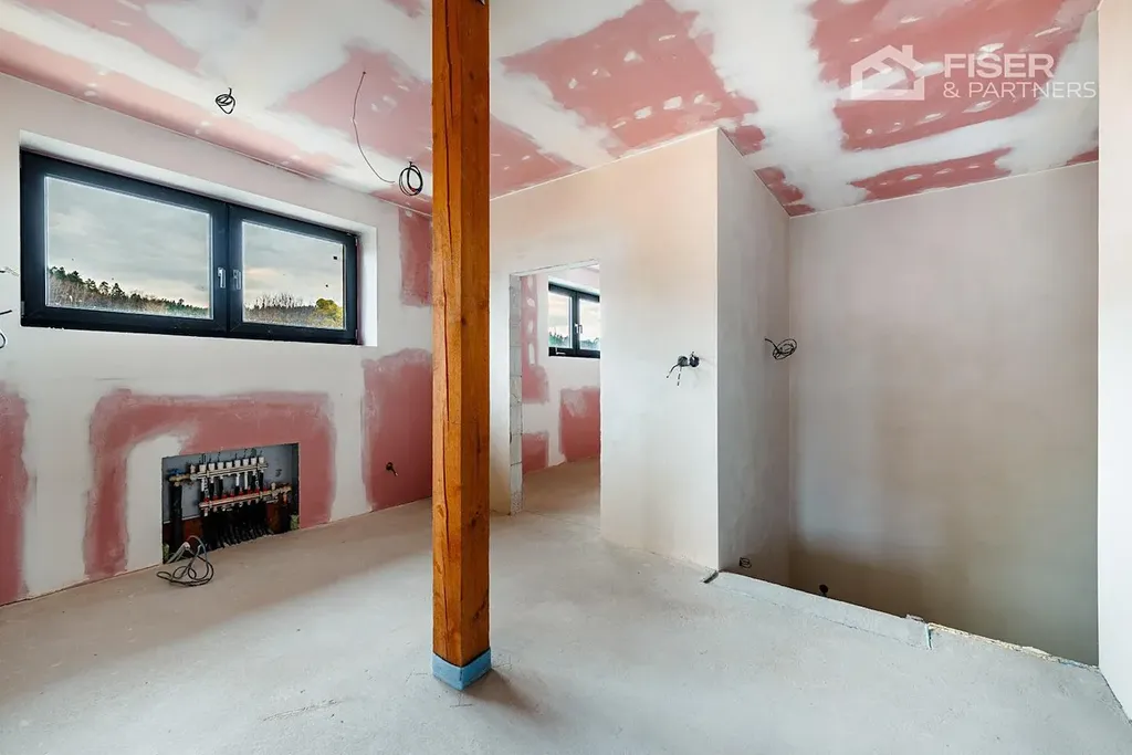 Nemovitost je ve fázi dokončených omítek veškeré rozvody vody, elektřiny i odpadů jsou již hotové. Budoucí majitel tak řeší už jen finální úpravy, jako jsou obklady, podlahové krytiny a vybavení nábytkem.