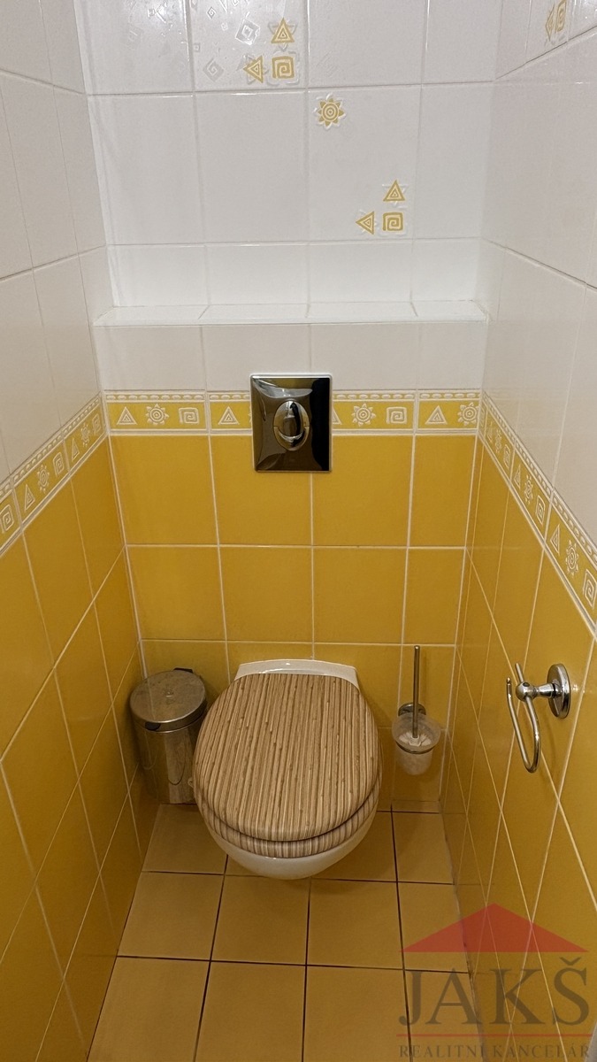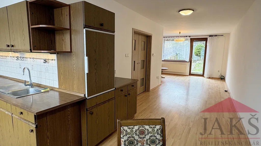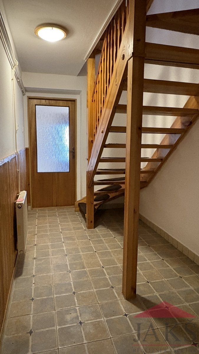 Popis: vydlážděné parkovací místo před domem; suterén 42,33 m2; garáž, technická místnost (el. boiler, umyv., vývod na pračku, rozvod dálkového topení pro sousední řadovky), chodba s dřevěným schodištěm do 1.NP 43,52 m2: podesta (kazetové dveře), sam. WC s umyv., prostorný obývací pokoj 36 m2 s kuch. koutem (kuch. linka s vestavěnou lednicí s mrazákem) a franc. dveřmi na terasu se zahradou; 2.NP 36,05 m2: podesta, koupelna (umyv. se zrcadlem, velká rohová vana, WC, topný žebřík) s oknem, 2x ložnice (vestavěné šatní skříně) a nízká půda.