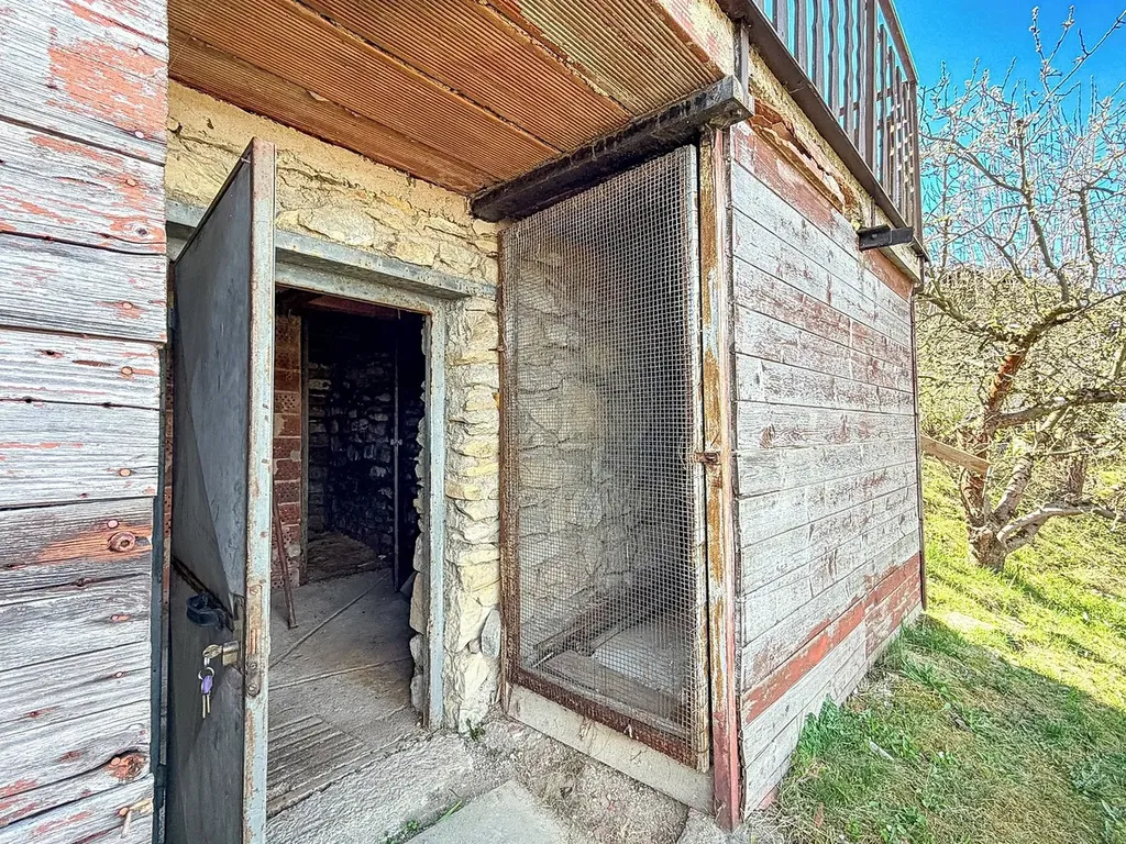 Jedná se o zděnou chatu na kamenném sklepě se sedlovou střechou. Stojí ve stráni, takže sklep je přístupný ze spodní zahrady. Tvoří ho 3 místnosti, kde můžete uskladnit vypěstovanou zeleninu a ovoce, uskladnit nářadí a nebo umístit chemickou toaletu.