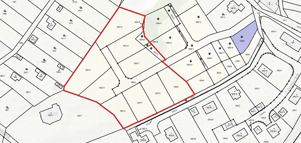 Pozemky tvoří soubor devíti pozemků a komunikace.