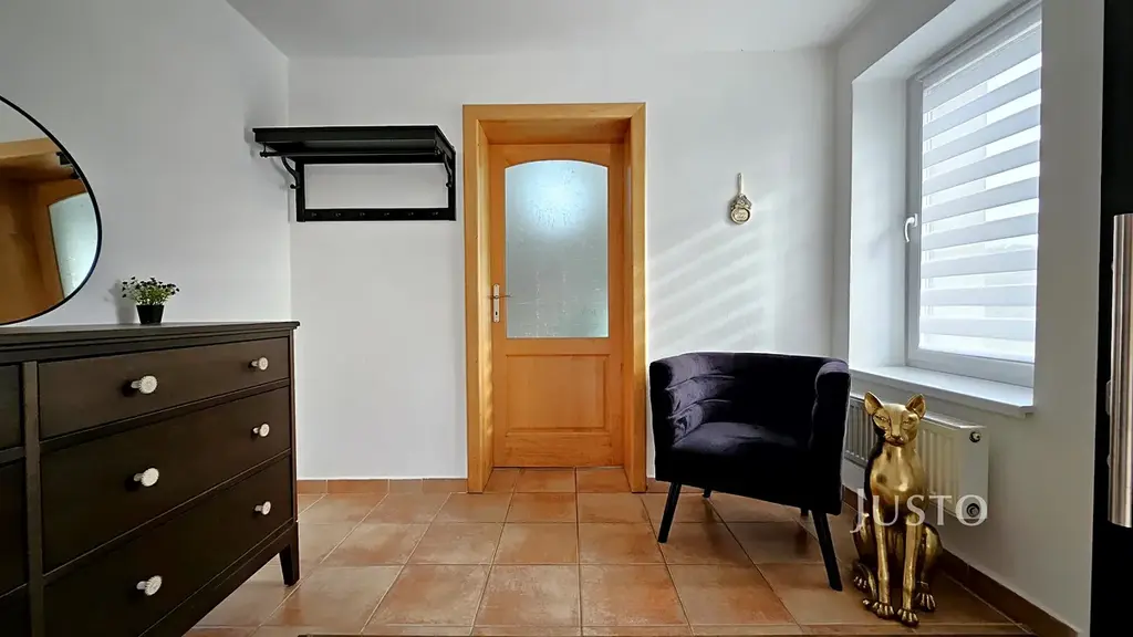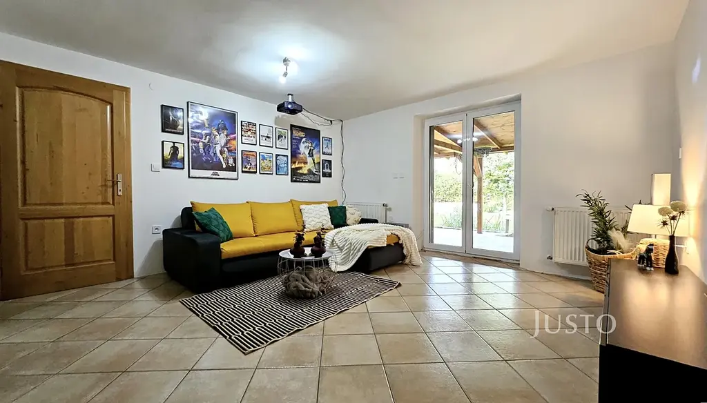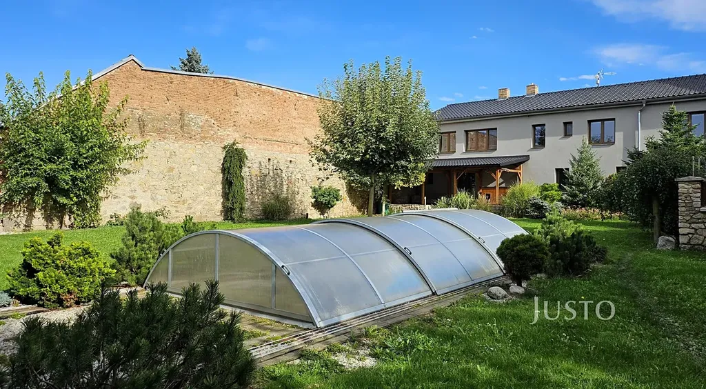 I když jde o řadovou zástavbu, máte zde absolutní soukromí. Zahrada je zatravněná, osázená keři, a kromě zastřešeného bazénu a vlastní studny se můžete těšit na garáž, průjezd, prostornou prádelnu a spoustu skladového prostoru. Parkovat můžete pohodlně i před domem.
