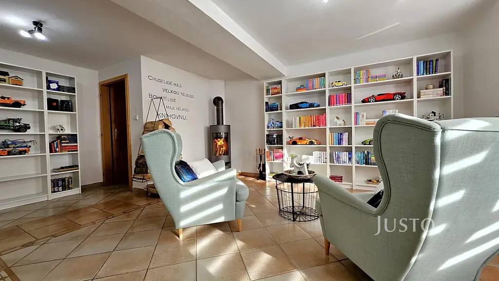 Hned po vstupu do domu vás okouzlí vzdušnost a kreativita interiéru. V přízemí na vás čeká relaxační hala (současní majitelé z ní udělali knihovnu s krbovými kamny –- ideální místo pro útěk před každodenními starostmi). Je tu také místnost se šatnou, která momentálně slouží jako domácí kino – ano, vlastní kino! A technika v domě zůstane, takže si můžete pustit film i bez vybalování krabic. Z místnosti je přímý vstup na terasu a zahradu s bazénem, který už sice nějakou dobu neviděl plavky, ale i tak je to luxusní prvek na zahradní párty.