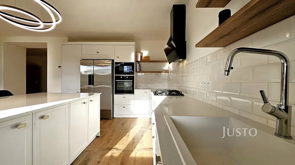 Dřevěným schodištěm se dostanete do 2. patra, kde najdete moderní kuchyň ve stylu Provence s ostrůvkem, velkým jídelním stolem a praktickou kuchyňskou linkou s dostatkem jak pracovního, tak úložného prostoru. Je to místo, kde bude celá rodina pohromadě, ale každý bude mít dost místa pro svoje aktivity. Na kuchyň navazuje obývací pokoj s výhledem do zahrady – ideální prostor pro lenošení.
