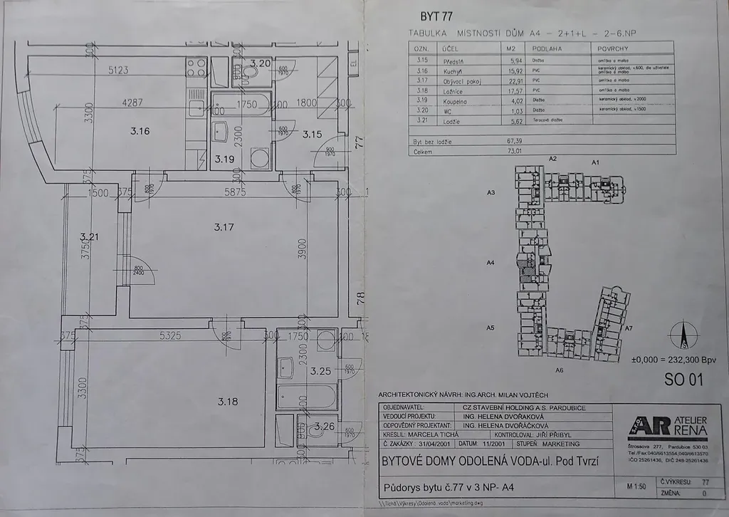 Byt o celkové ploše 73,01 m² se nachází ve druhém patře pětipatrového, bezbariérového, cihlového domu s výtahem.