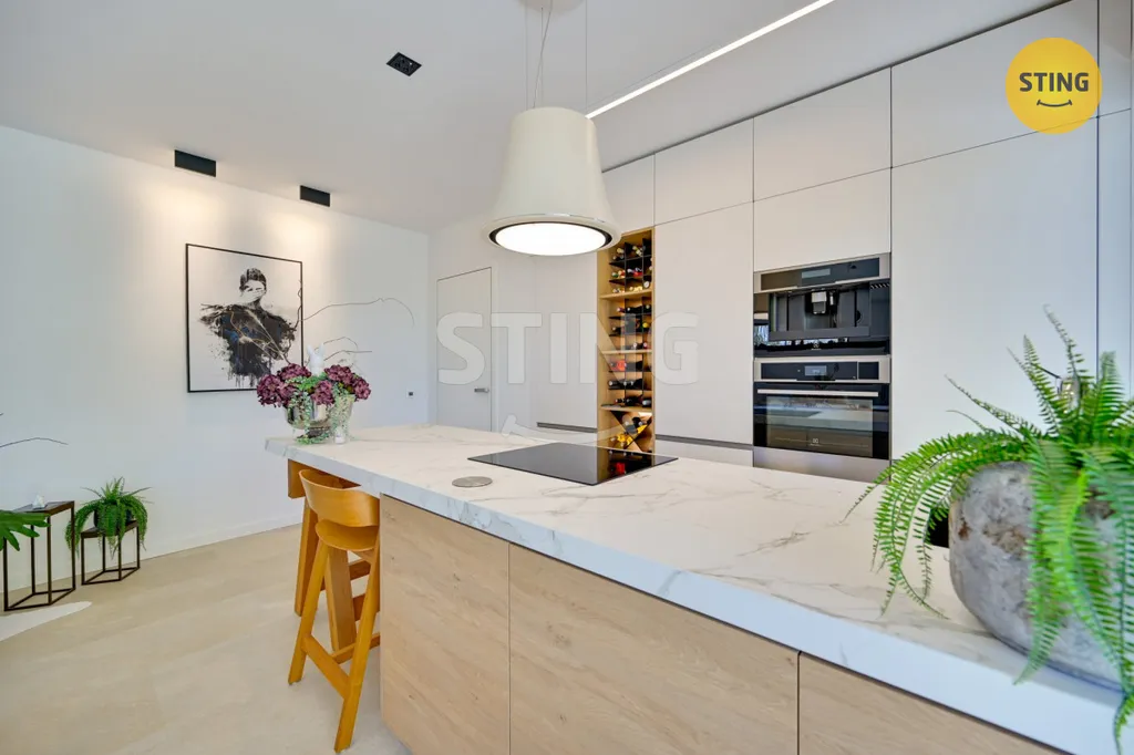 Exteriér domu nabízí rozsáhlou zahradu s maximálním soukromím, zatravněnou plochou a pečlivě navrženou zelení včetně bambusu podle návrhu zahradního architekta. Součástí je bioklimatická hliníková pergola o velikosti 24 m² s otočnými lamelami a elektrickými roletami se senzory proti dešti a větru, která umožňuje komfortní relaxaci za každého počasí. K dispozici je také vyhřívaný bazén s vířivkou Canadian Spa Mollus XXL o rozměrech 10 m² s pískovou filtrací a osvětlením. Terasa kolem bazénu je z materiálu Woodplastic a Terafest premium, doplněná o betonové a kamenné povrchy Piedra. Pro parkování slouží kryté stání pro dvě vozidla, pozemek je oplocen gabionovým plotem s elektrickou bránou a videotelefonem. Na zahradě se nachází také dřevník Korten, ohniště a zahradní domek o velikosti 14 m² s regálovým systémem.