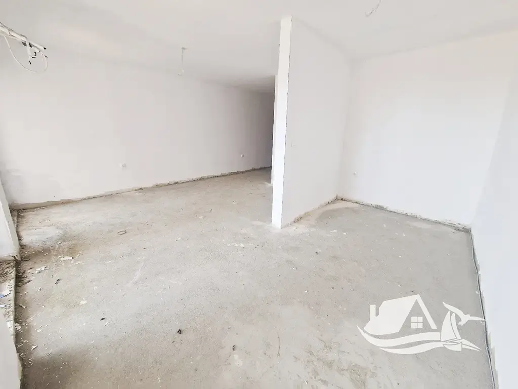Apartmán o celkové ploše 56 - m² a čisté obytné ploše 46 - m² se nachází ve třetím podlaží a nabízí chytré a flexibilní řešení prostoru. Dispozice je otevřená, ale zároveň dává možnost oddělit spací část a vytvořit tak plnohodnotné 2+kk. Vstupní chodba vede do hlavního obytného prostoru s kuchyní, který přirozeně propojuje denní i noční zónu. Balkon s výhledem na moře dodává celému bytu hloubku a pocit volnosti.