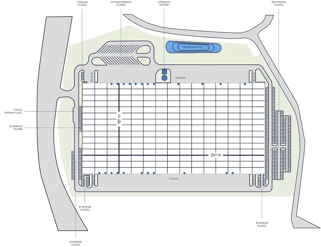 Celková plocha areálu činí téměř 38 800 m² a je připravena přizpůsobit se potřebám jednotlivých nájemců. Skladové jednotky lze rozdělit na plochy od 2 000 m², 5 000 m² nebo 10 000 m², kanceláře pak navrhnout přesně podle požadavků budoucího uživatele. Areál může být k dispozici do 12 měsíců od podpisu nájemní smlouvy.