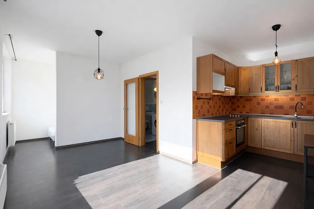 K vybavení bytu patří kuchyňská linka se spotřebiči (lednice, trouba, varná deska) a v koupelně je pračka. V bytě můžeme ponechat postel vč. matrace o rozměru 140x180cm.