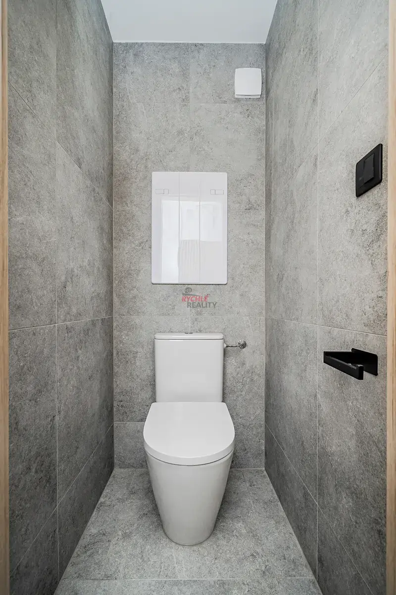 Koupelna bude ještě dovybavena zrcadlem s osvětlením a vanovou zástěnou.