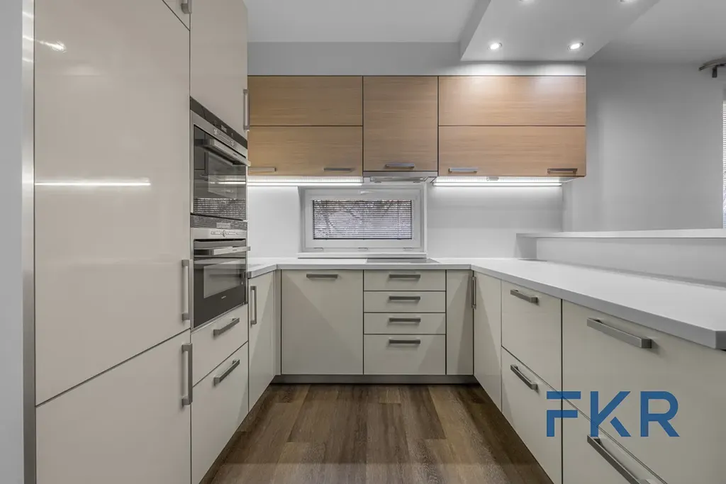 Hlavní obytnou část představuje obývací pokoj s přímým vstupem na zasklený balkon orientovaný do zeleně. Součástí prostoru je prémiová plně vybavená kuchyňská linka s vestavěnými spotřebiči.
