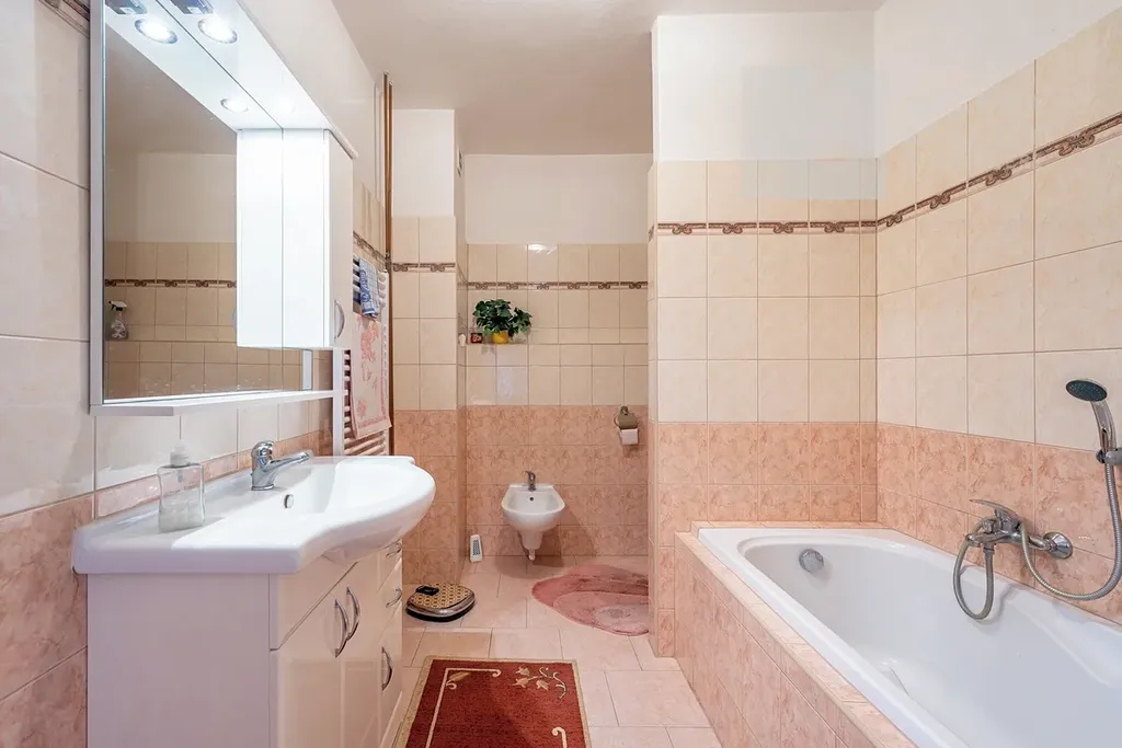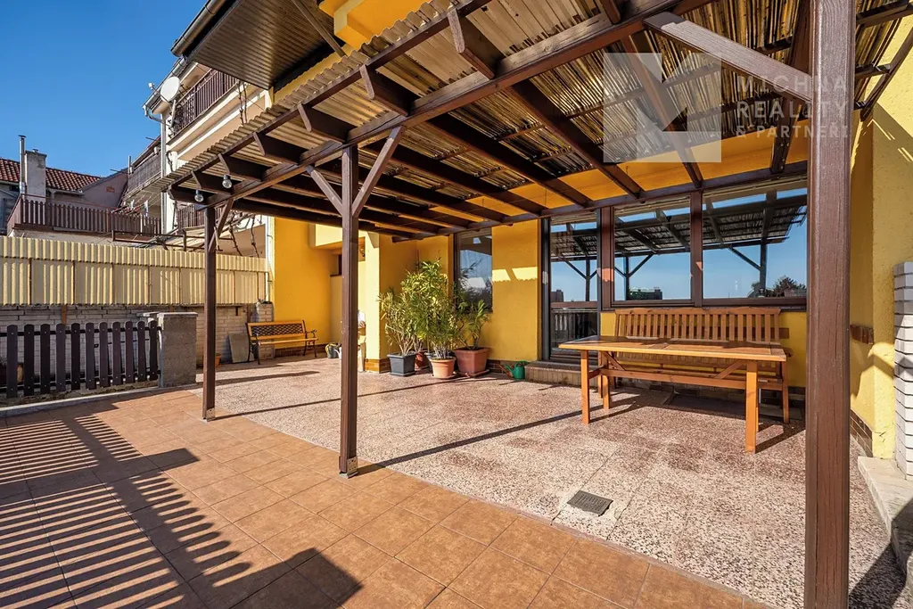 1. NP (78 m² + terasa 21 m² + lodžie 3,9 m²) – obytné prostory s komerční jednotkou (aktuálně kadeřnictví), sociálním zázemím a s přímým vstupem na terasu a zahradu s bazénem.