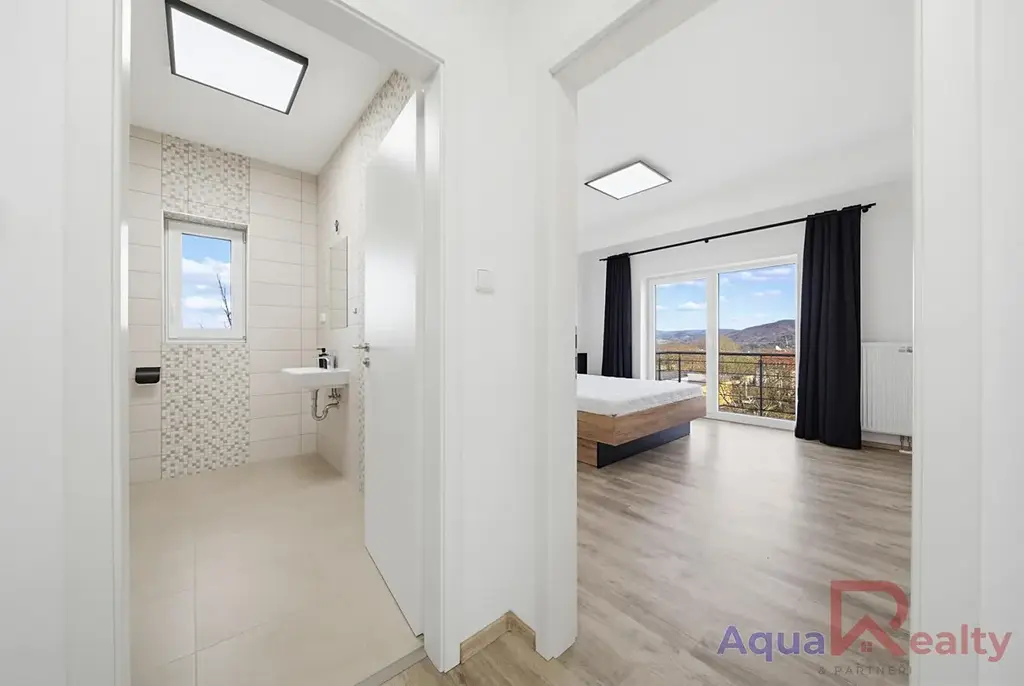Byt dále nabízí prostornou ložnici s přímým vstupem na balkon, odkud se otevírá krásný výhled do okolní krajiny. Další pokoj lze využít jako dětský pokoj, pracovnu či pokoj pro hosty. Všechny místnosti jsou laděny do světlých tónů a sjednoceny kvalitní vinylovou podlahou. Vstupní chodba disponuje praktickou vestavnou skříní, která nabízí dostatek úložného prostoru.