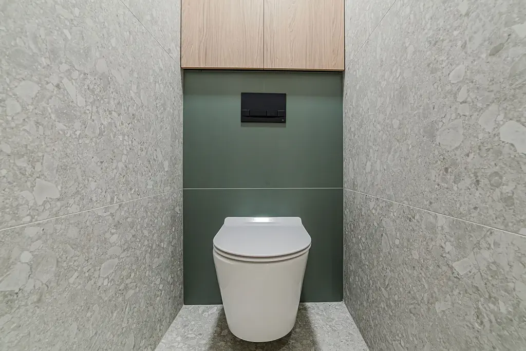 Koupelna je velkorysá a disponuje vanou, místem pro pračku a sušičku, což je jistě velkým přínosem pro moderní rodiny. V koupelně požité velkoformátové obklady 120x60. Toaleta oddělena.