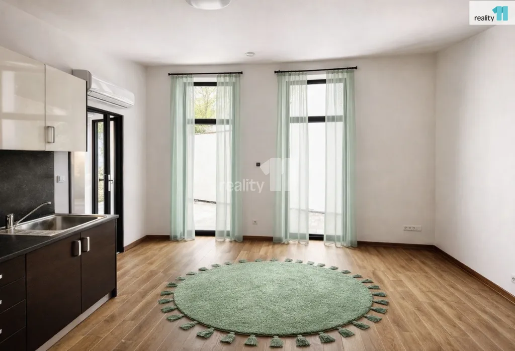 Byt je nezařízený, k dispozici je pouze kuchyňská linka s elektrickým sporákem a troubou. Hlavní obytná místnost je světlá, s velkými francouzskými okny orientovanými do klidného vnitrobloku.