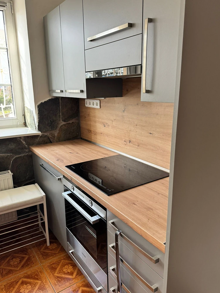 Kuchyně je vybavená sklokeramickou varnou deskou, vestavnou horkovzdušnou troubou a myčkou.