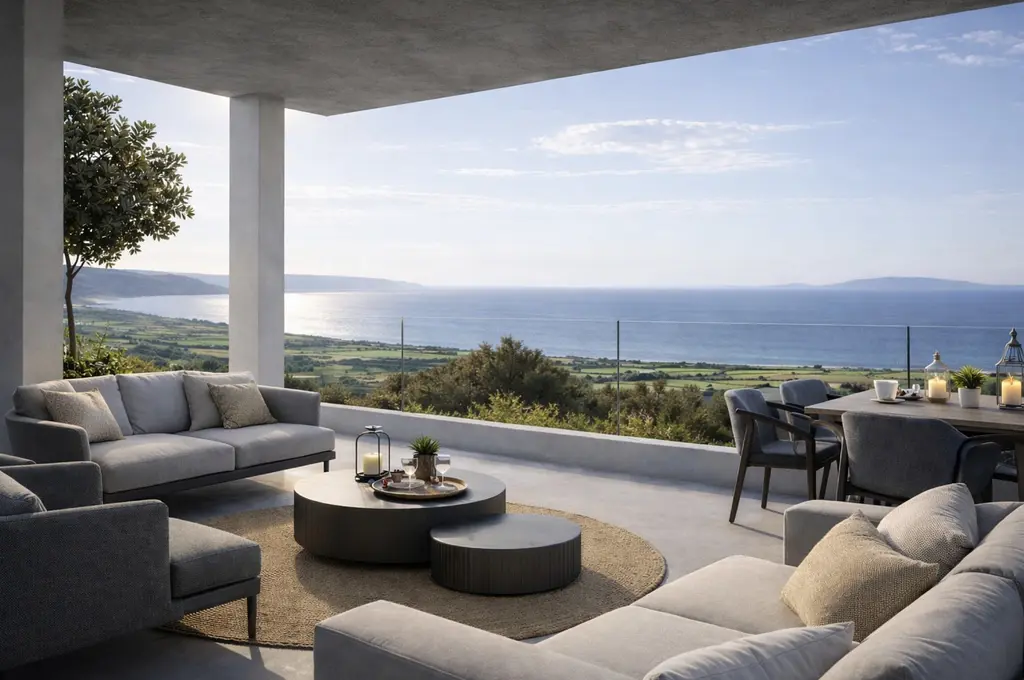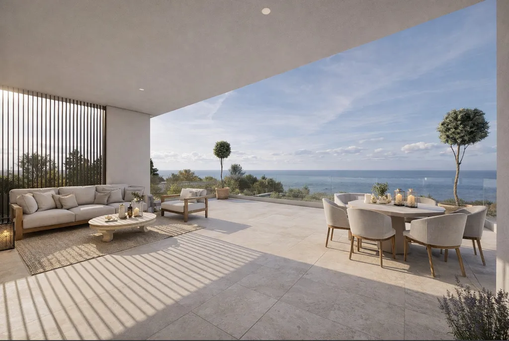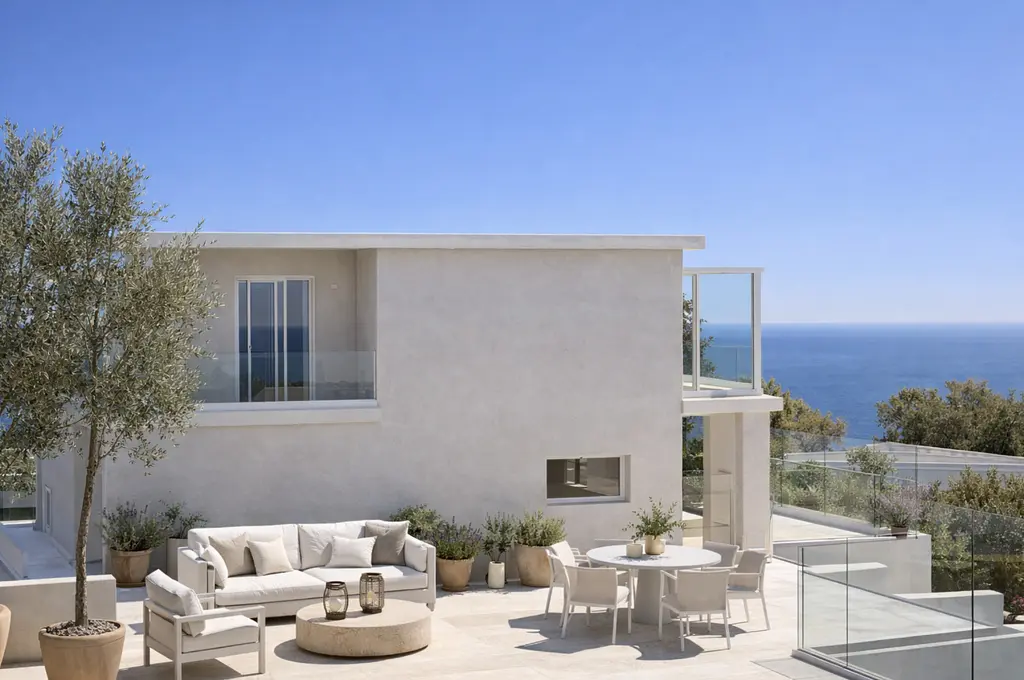 Součástí nemovitosti je soukromý bazén, panoramatické terasy a zahrada obklopená středomořskou vegetací. Vila je orientována na západ, což zajišťuje každodenní výhled na západy slunce nad mořem.