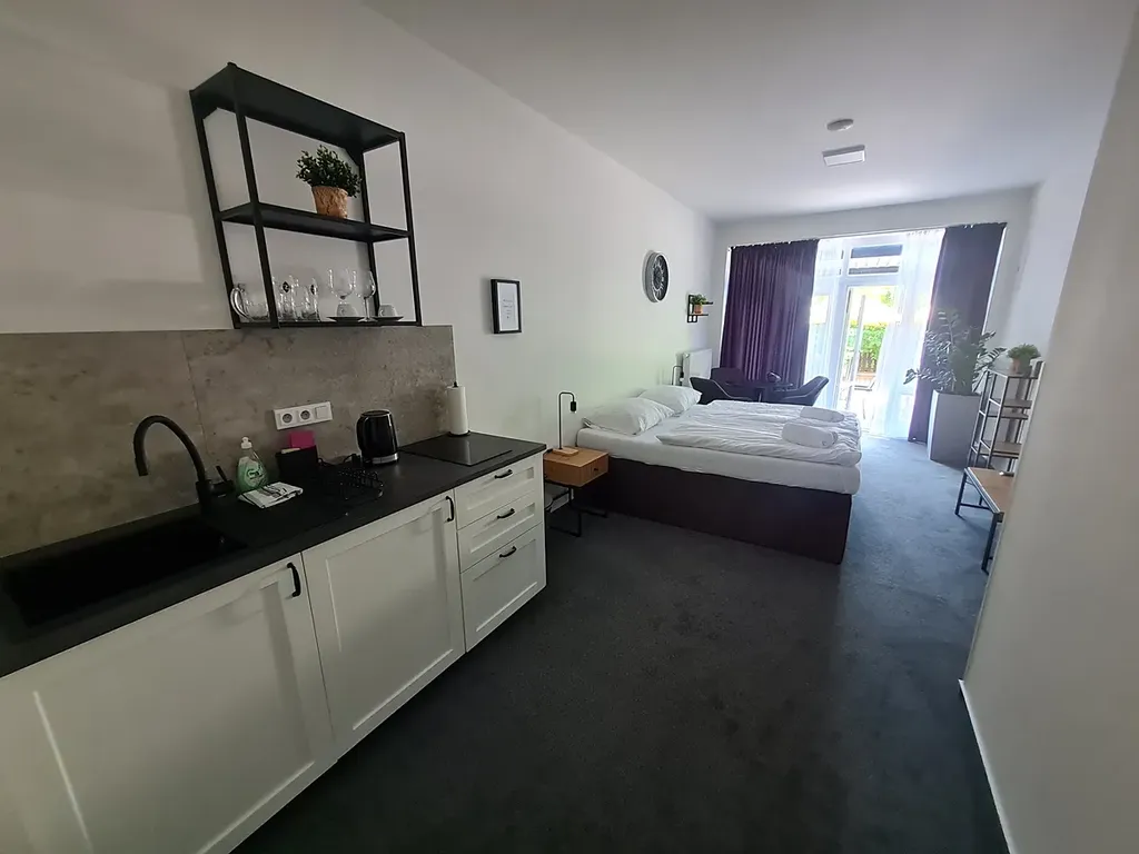 V 1.NP se nachází pět apartmánů s kuchyňkami a soc. zařízením se sprchovými kouty a WC, dále jeden čtyřlůžkový (dvě místnosti), a jeden třílůžkový pokoj (jedna místnost) se sprchovými kouty a WC.