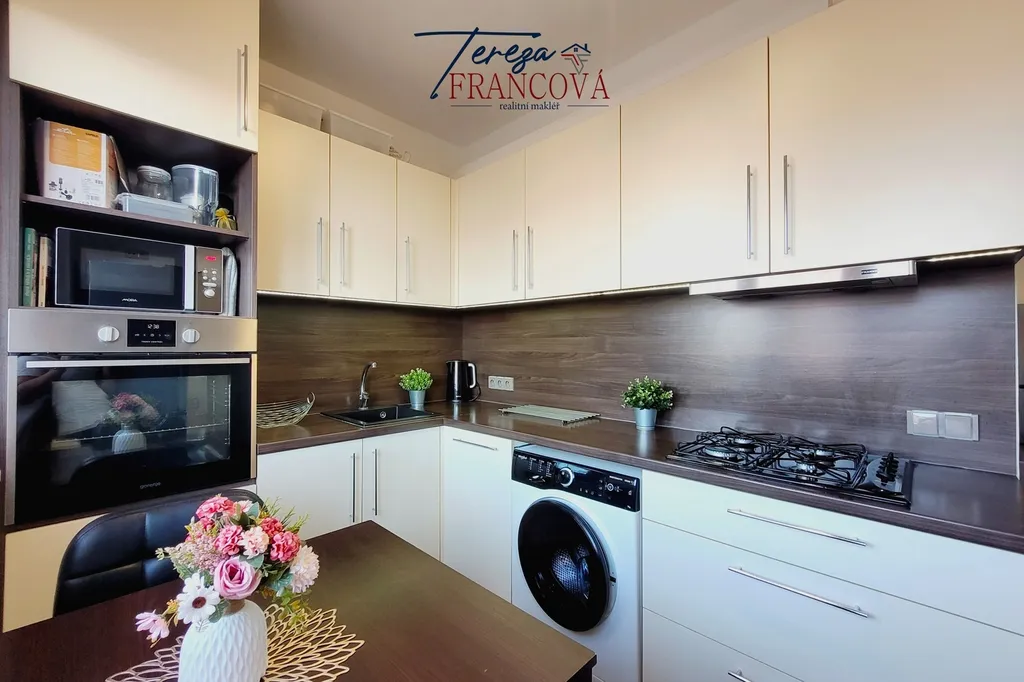 Po vstupu do bytu vás přivítá chodba s vestavěnými skříněmi, které poskytují dostatek úložného prostoru. Samostatná kuchyně je vybavená moderní kuchyňskou linkou s vestavnými spotřebiči, takže máte vše potřebné ihned k dispozici.