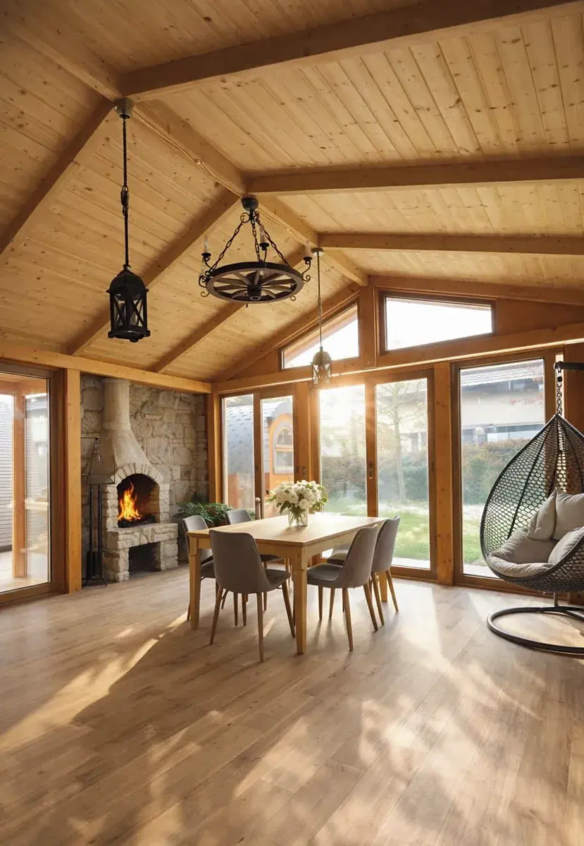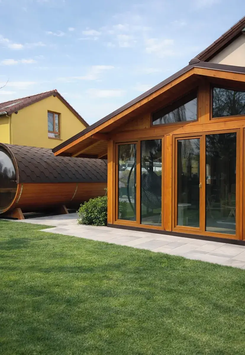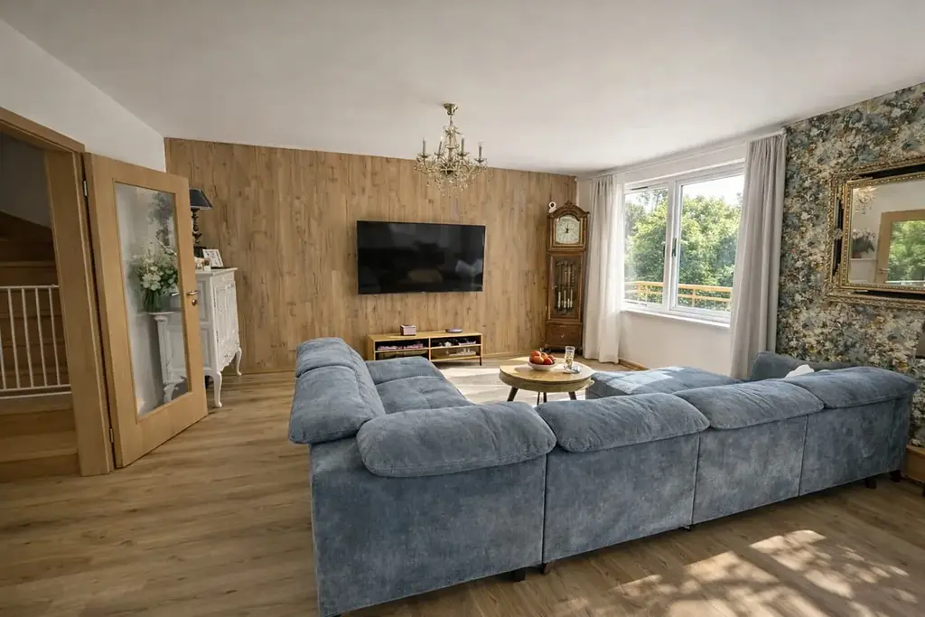 V přízemí se nachází prostorný obývací pokoj s velkou kuchyní a jídelní částí – srdce rodinného života. Prostor je světlý a nabízí přímý vstup na krytou terasu s podlahovým vytápěním, kterou lze využívat po celý rok. Navazuje otevřená terasa a udržovaná zahrada – ideální místo pro rodinné večeře, hry dětí nebo odpočinek s přáteli.