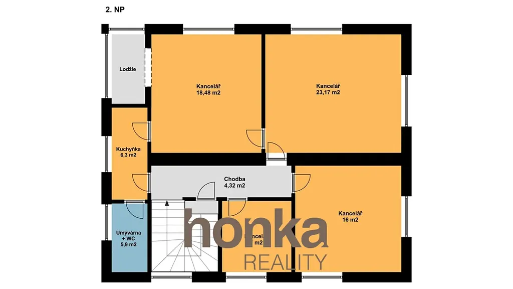 Čtyři kanceláře (jedna průchozí), čajová kuchyňka, koupelna se sprchovým koutem, WC a zasklená lodžie.