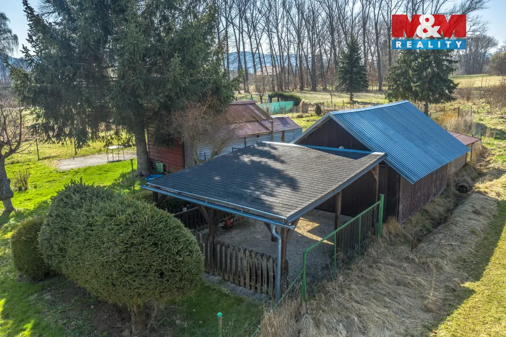 Na pozemku se nachází přístřešek a plechové zahradní domky.