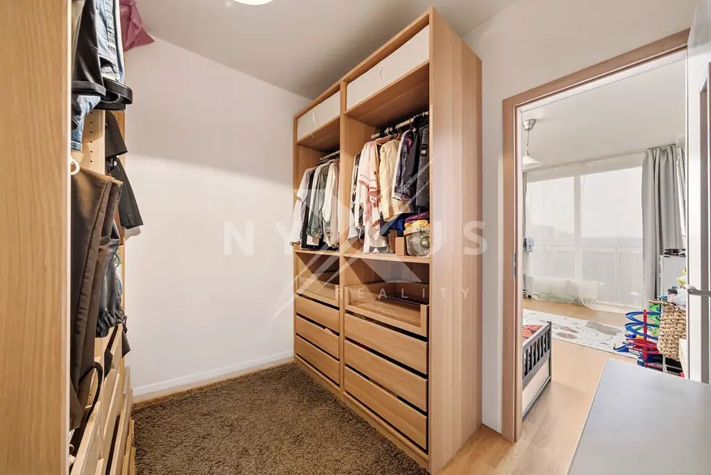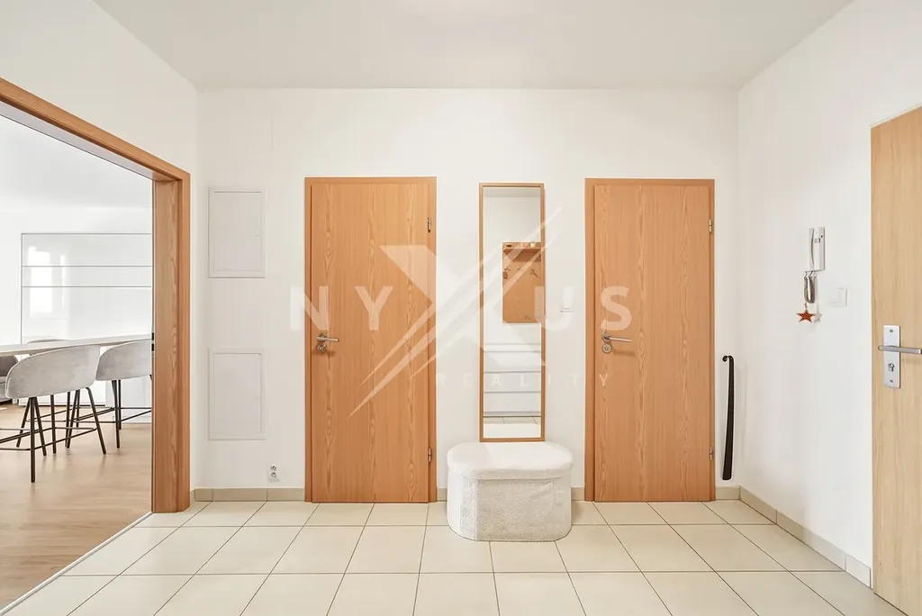 Velkým benefitem je také samostatná šatna a komora v bytě, díky nimž interiér nepůsobí zahlceně a nabízí praktické úložné zázemí. Byt se nachází v 6. nadzemním podlaží cihlového domu z roku 2011. Jižní orientace a francouzská okna přinášejí do interiéru velmi dobré světelné podmínky, zatímco vyšší podlaží nabízí příjemný odstup od okolního ruchu i otevřenější výhled směrem k Milíčovskému lesu. Komfort každodenního fungování podporuje garážové stání, sklep, kolárna v domě, centrální vytápění i samostatné WC. K dispozici jsou navíc dva osobní výtahy a dva auto výtahy.