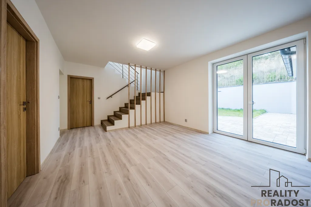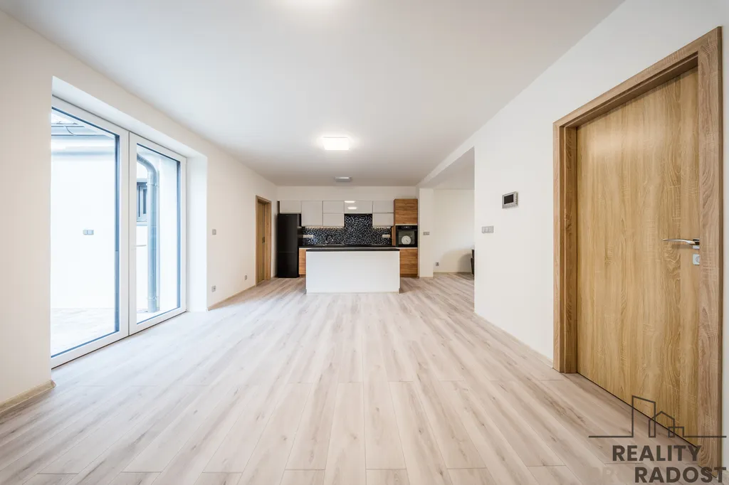 - obývací pokoj s kuchyní a jídelnou s francouzskými dveřmi na dvůr