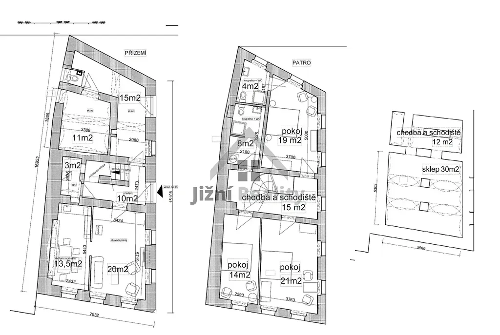 V nemovitosti se nachází krásný 30 m2 sklep + schodiště. V přízemí domu se nachází obývací pokoj, kuchyň, chodba se schodištěm, WC, sklad, zádveří a spíž. V prvním patře se nachází tři pokoje (dva s koupelnou a WC), dále koupelna s WC a chodba. V podkroví lze vybudovat ještě další pokoje.