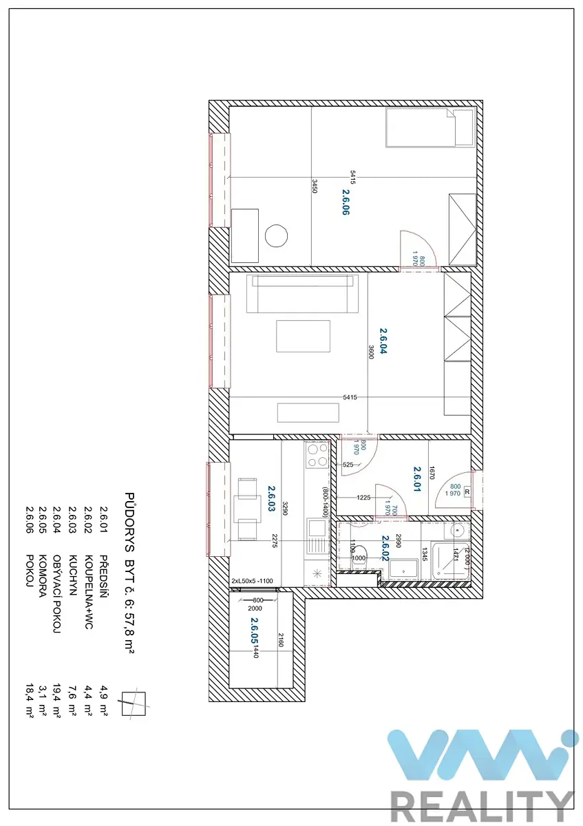 Kuchyň je samostatná, za kuchyní je prostor pro lednici. Další pokoj je samostatný, průchozí do dalšího samostatného pokoje. Kuchyň je vybavená linkou včetně vestavěných spotřebičů (myčka, sklokeramická deska, elektrická trouba, digestoř, bez lednice). Koupelna a toaleta jsou spojené, v koupelně je sprchový kout a umyvadlo se skříňkou.