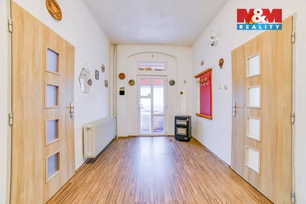 Přízemí nabízí obývací pokoj, kuchyni s jídelnou, ložnici, koupelnu, samostatné WC, dílnu, garáž a technické zázemí. V patře je druhý byt s kuchyní, pokoji a příslušenstvím. Dům je podsklepen, k dispozici je také prostorná půda vhodná k vestavbě.