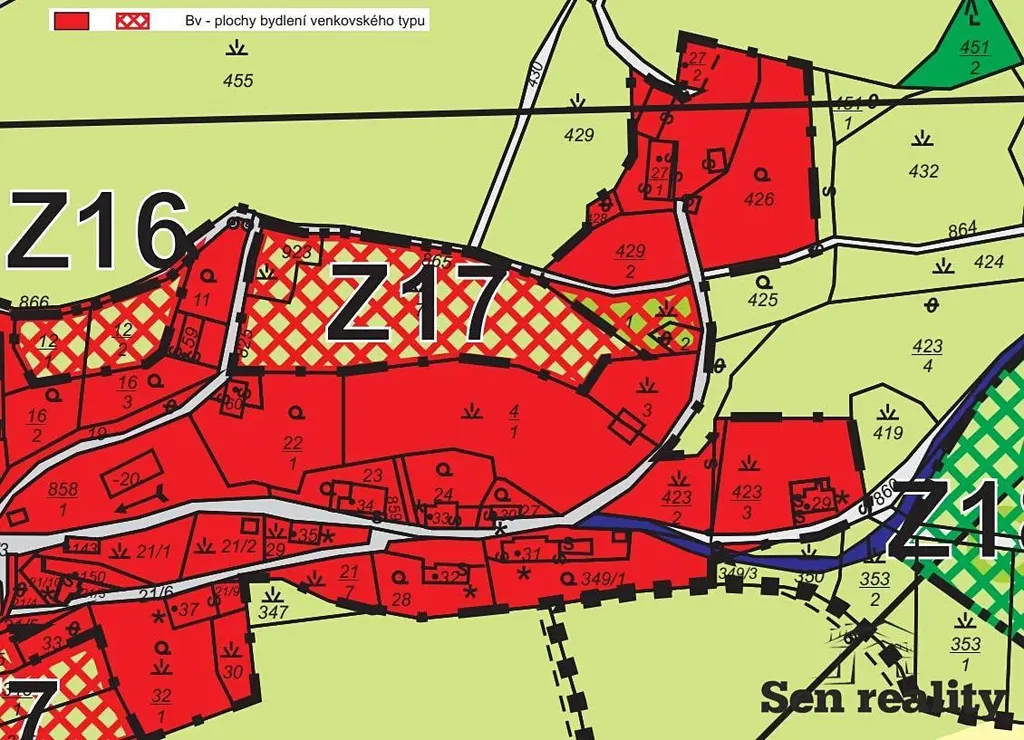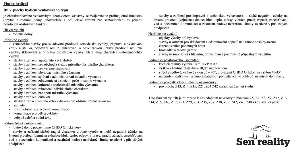 Pozemek se nachází v zastavitelném území obce s označením BV - plochy bydlení venkovského typu, podrobnější informace a přípustné a nepřípustné využití naleznete ve fotografiích.