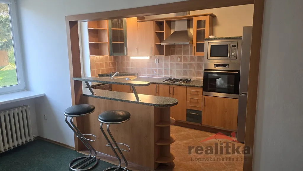 Z prostorné vstupní haly, kde jsou velké vestavěné skříně je vstup do 3 samostatných pokojů. Dále je zde kuchyň, která odděluje prostornou jídelnu. V kuchyni je zabudovaná elektrická trouba, mikrovlnka, plynová deska s digestoří, myčka, volně stojící lednice s mrazákem a spoustu úložného prostoru. Koupelna včetně wc prošla kompletní, moderní rekonstrukcí. V koupelně je sprchový kout, umyvadlová sestava a napojení na pračku. Wc je zvlášť. Vedle koupelny je komora. Ze dvou pokojů je vstup na velkou terasu 15m2, která má nově zrekonstruovanou dřevěnou podlahu. Oba pokoje jsou situované do klidné části plné zeleně. V ceně nájmu je zahrnuto 1 parkovací stání ve dvojgaráži. Dále je zde velký zděný sklep 12m2 s uzamykatelnými vchodovými dveřmi.