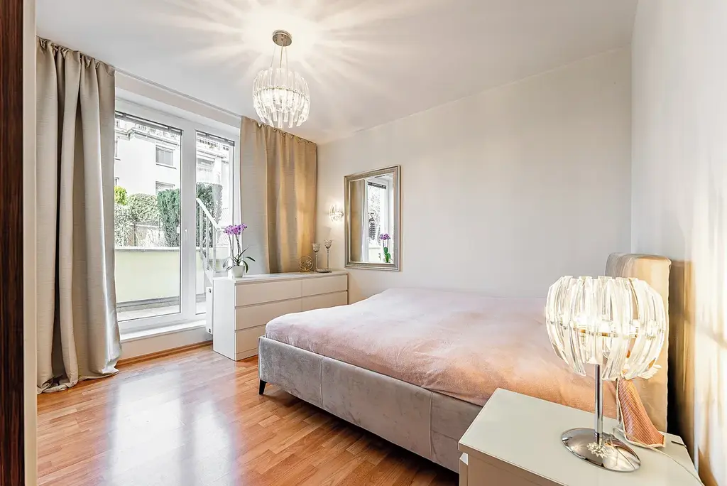Dominantou bytu je obývací pokoj (22 m²) plynule propojený s moderním kuchyňským koutem (12 m²). Díky velkoformátovým oknům a jihovýchodní orientaci je prostor po celý den příjemně prosvětlený. Kuchyně je plně vybavena a nabízí dostatek pracovní plochy. Z obývací části je přímý vstup na balkon (7,54 m²) s předokenní roletou – ideální místo pro ranní kávu.