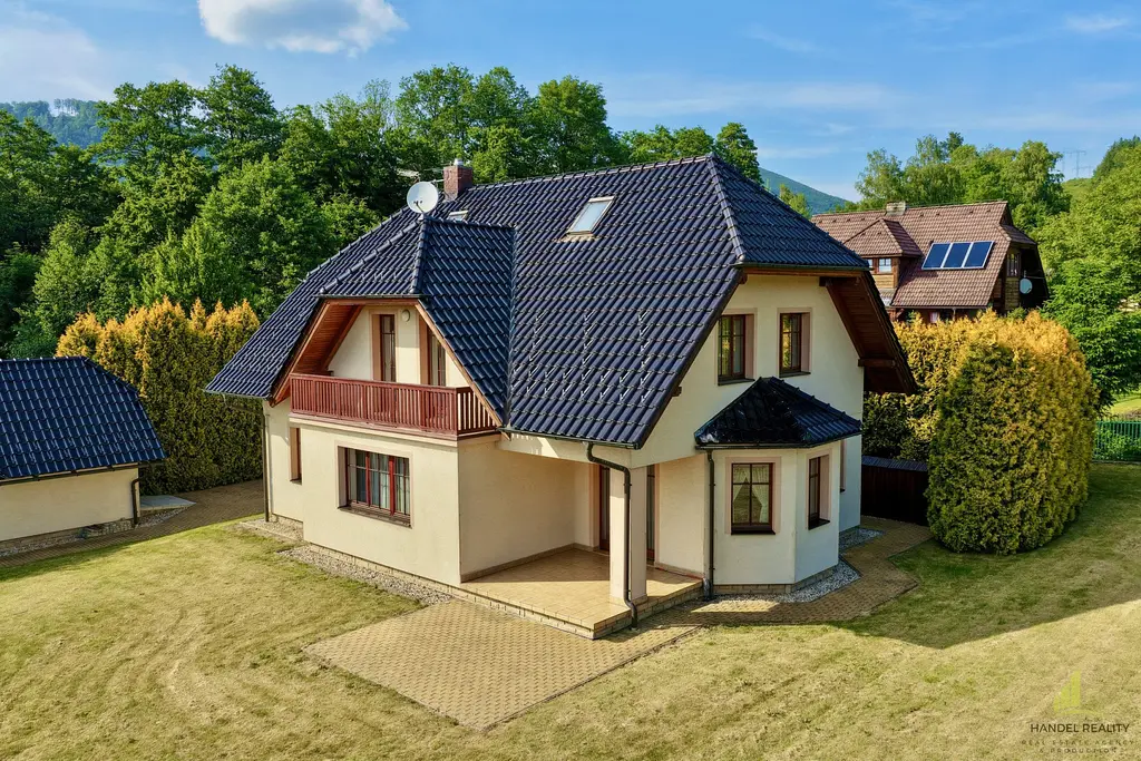 Praktická dispozice domu nabízí pohodlí a prostor pro celou rodinu. Po vstupu do domu se ocitnete v předsíni, ze které vedou dveře do chodby a druhé dveře do prostorné šatny 11 m². Po vstupu do chodby jsou schody do prvního patra, dveře do obývacího pokoje, samostatné WC a technická místnost s umyvadlem. V této části domu se rovněž nachází vstup do prostorného obývacího pokoje s krbovými kamny a kuchyně o rozloze 44 m². Z kuchyně je přímý vstup na venkovní terasu. První patro domu tvoří 3 prostorné ložnice o rozloze 27 m², 24 m² a 21 m², ze dvou pokojů je přístup na balkón 6,4 m². Dále se zde nachází koupelna 16 m² se sprchou, vanou a toaletou.
