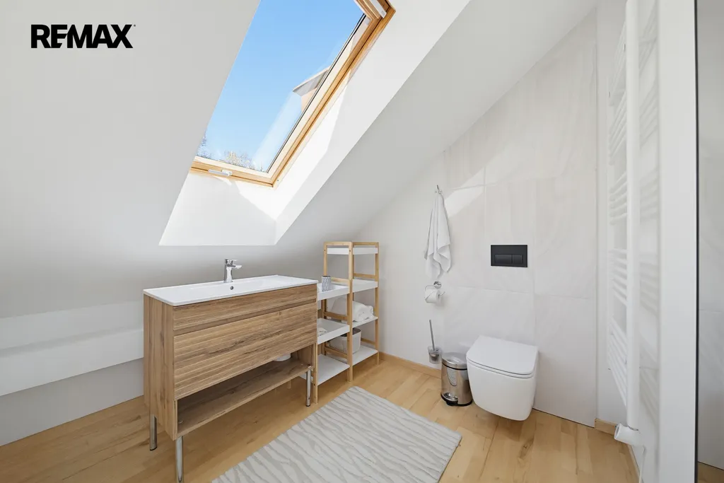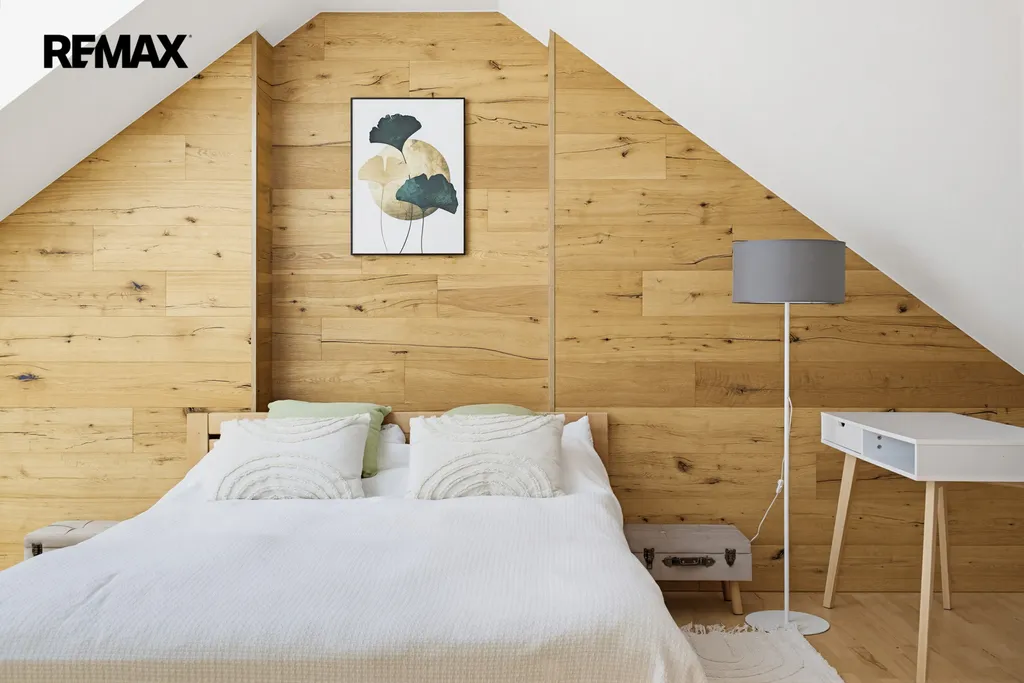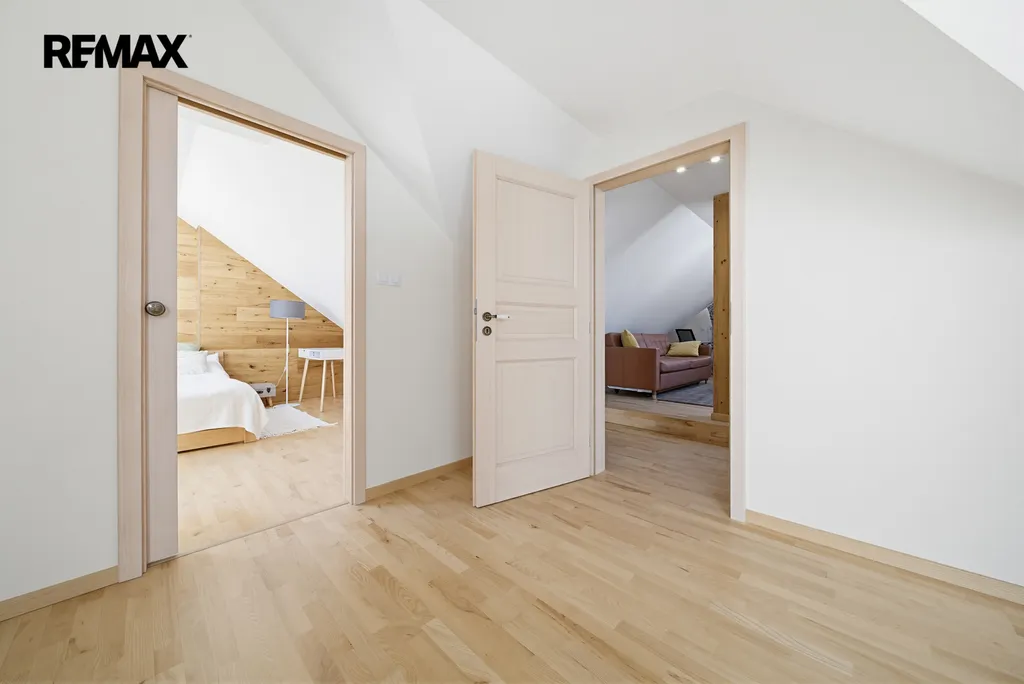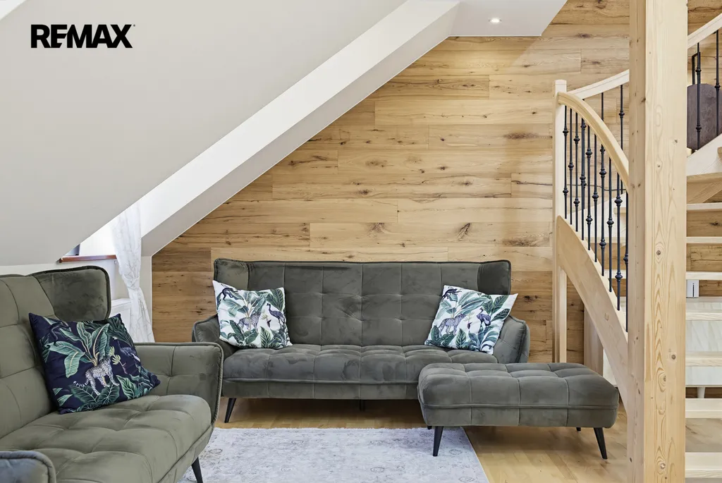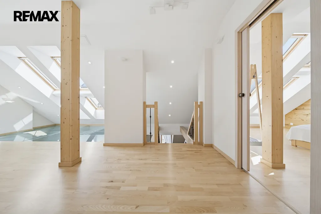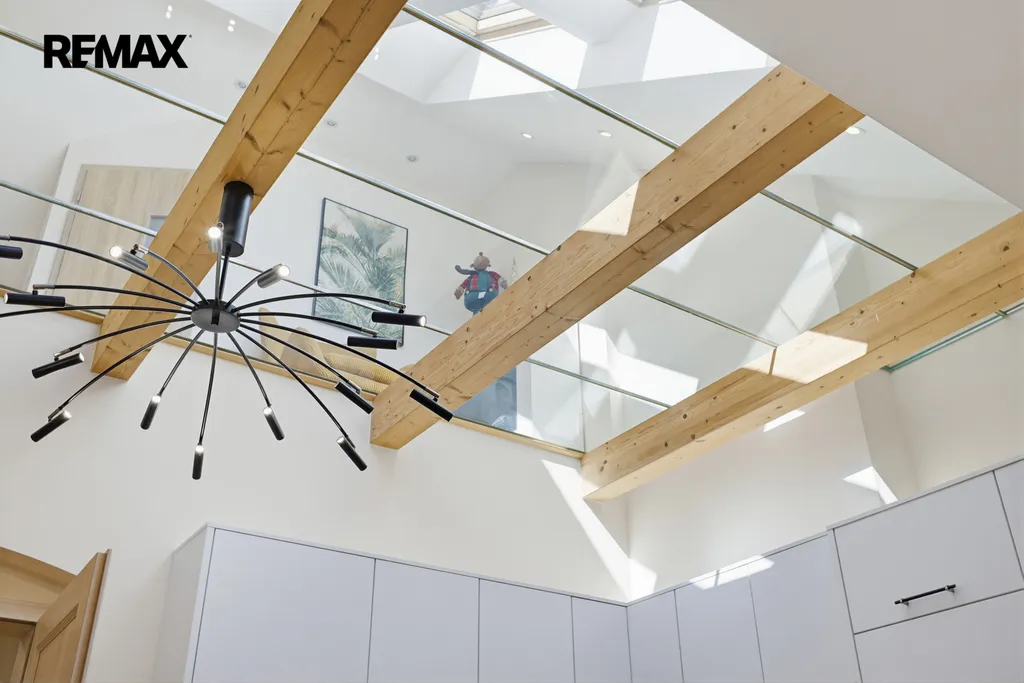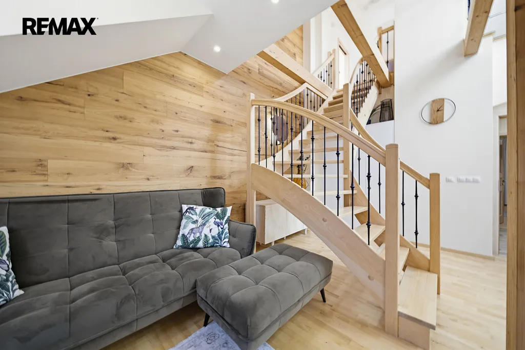 Interiér zaujme na první pohled – světlé tóny, přírodní materiály, masivní dřevo a čisté linie vytvářejí klidnou a elegantní atmosféru. Dominantou prostoru je otevřený koncept s galerií a přiznanými trámy, který působí vzdušně a luxusně.