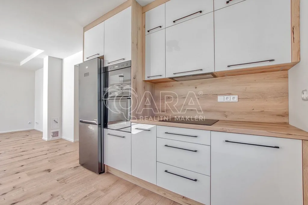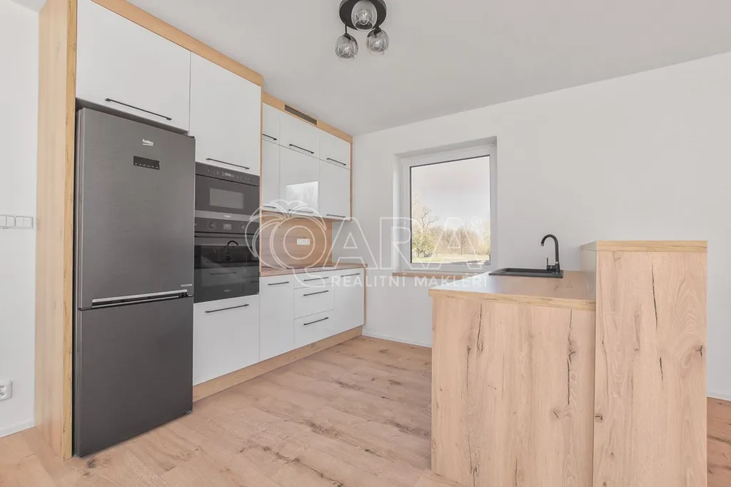 Moderní kuchyňská linka zahrnuje nové spotřebiče, včetně elektrické trouby, indukční desky, myčky, mikrovlnky a lednice. Obývací pokoj je navíc připraven na instalaci krbu nebo krbových kamen.